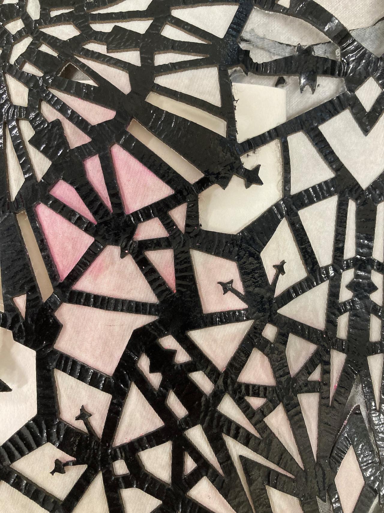 Snowflake dress was purchased for the NGV Collection from a specialist vintage fashion dealer, who acquired it from the original owner. As a textile conservator, I cannot help feeling joy that a dress has had a life, as this one evidently has. The dress had curious stains and white accretions, and numerous tears to the fragile silk tulle. Both the leather shell and the corset of the underdress had been let out significantly by adding fabric extensions and chunky plastic zips which were not original. Quirky bright pink stains were especially visible on many areas on the tulle skirt as well as the leather and white silk components. These appeared as solid accretions but in some places an unsuccessful attempt at cleaning had been made, causing the stain to spread. The accretions had the appearance of sugar with red food colouring, likely to be candy floss or pink icing.