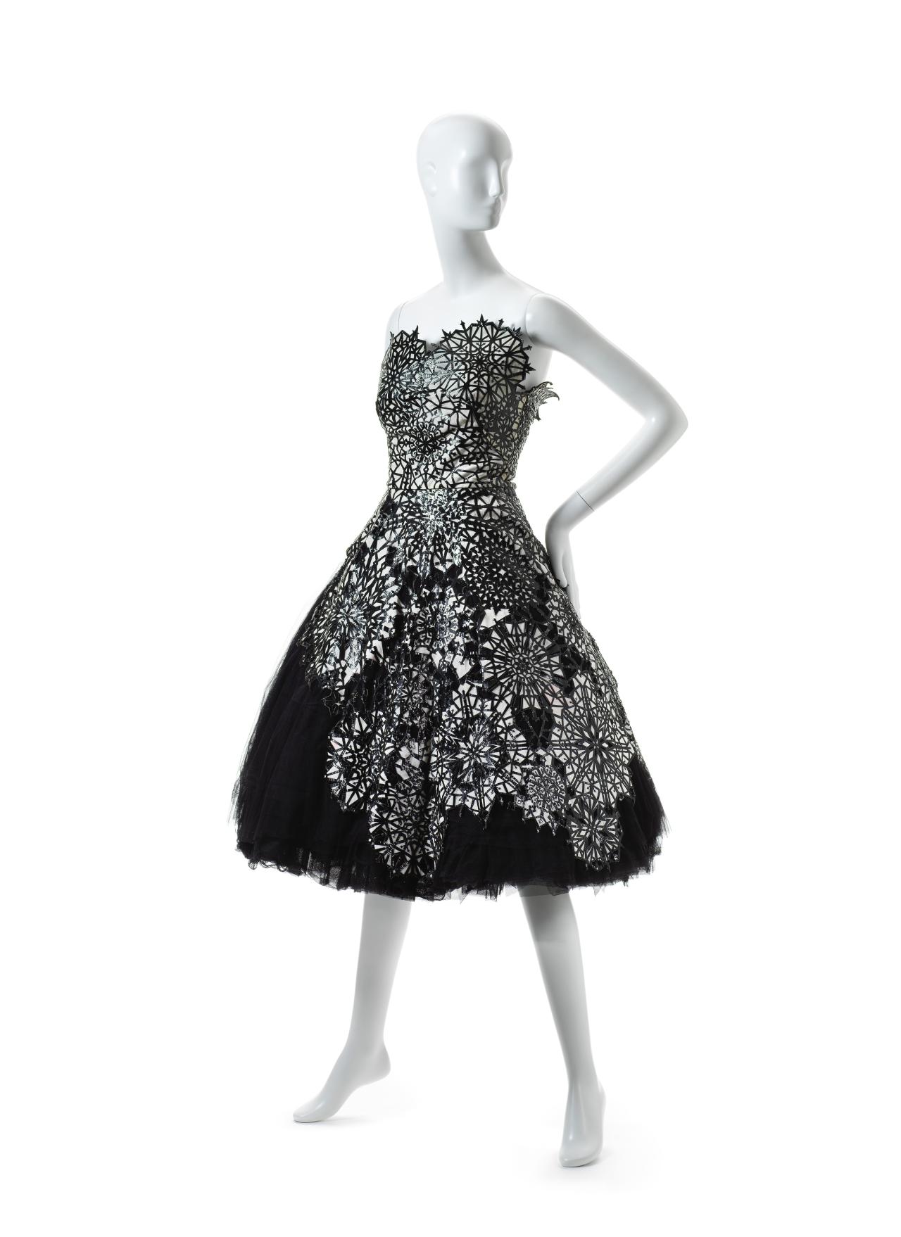 It’s February 2008 and Alexander McQueen is presenting one of his now-renowned collections in Paris evocatively titled The Girl Who Lived in the Tree. The backdrop is inky black except for a spotlighted giant tree wrapped in fabric that dominates the set. The show begins and the models emerge, mostly dressed in black and tulle. One outfit to debut Look 20, is a black fitted dress with ballerina-esque tutu, overlaid with a stark black leather shell, laser cut in complex snowflake shapes, set against a white silk base. McQueen’s Look 20, unofficially called the Snowflake dress, the work turns the pretty and delicate snowflake on its head. The NGV warmly thanks Krystyna Campbell-Pretty AM and Family for enabling this acquisition for the NGV Collection.