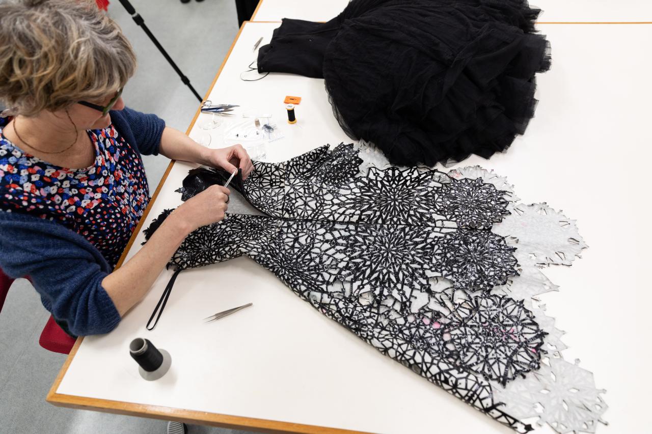 NGV Conservator of Textiles, Kate Douglas undertaking textile conservation of Look 20, dress 2008-2009