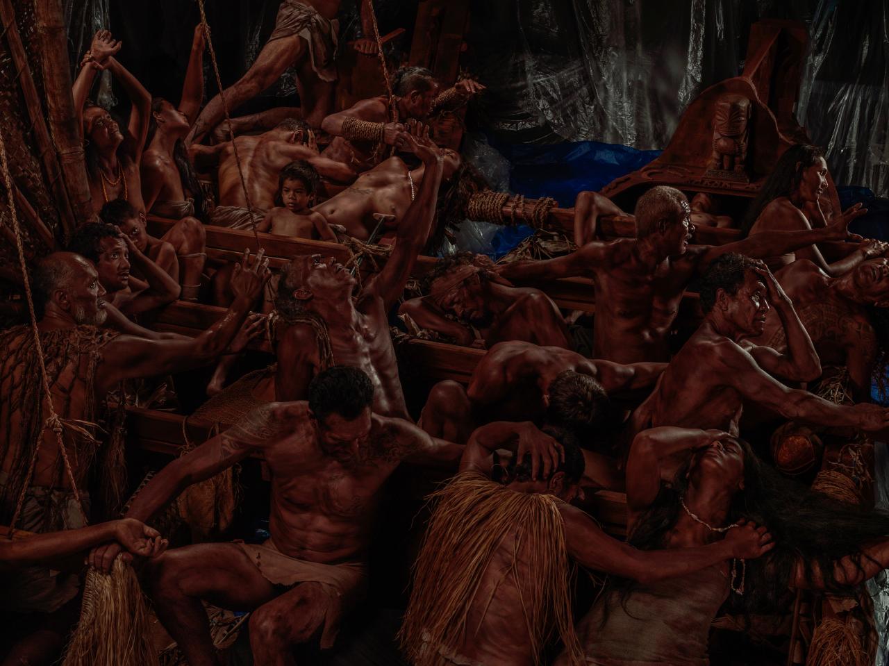 The artist constructed elaborate sets and cast twenty-two Cook Island residents as actors to create pictures of extraordinary detail and dramatic intensity. Semu purposefully selected local residents because their physiques accorded with his vision of strong and healthy Māori seafarers; in contrast to the classically idealised models seen in Géricault’s painting and the emaciated survivors in The Arrival. The location of the shoot, Raratonga, was also a metaphorical ‘last stop’ for boats on the Pacific Express migration line. A waka (double-hulled canoe) used in Māori migration voyages was carefully reproduced for the re-staging of The Arrival, which was later that same day stripped back and transformed into the simple raft modelled on the wreck of the Méduse. Semu extensively edited, reconfigured and deconstructed his digital photographs to create memorable compositions that appropriate art history and simultaneously provoke and disrupt accepted views of history.