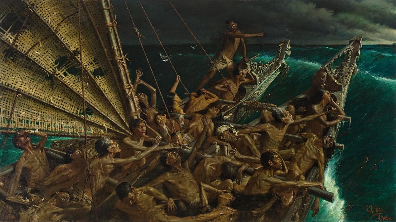 The subject and composition of The Arrival of the Māoris in New Zealand parallels that of The Raft of the Medusa. The latter depicts the wreck of the French naval frigate Méduse, which ran aground off the coast of what is today Mauritania, and the tragic starvation of all but fifteen of 147 passengers set adrift on a hurriedly constructed raft. Semu was struck by the close visual similarities between the two paintings: Goldie and Steele’s appropriation of the earlier work validated his reading of The Arrival of the Māoris in New Zealand as a construction in the grand narrative tradition of European history painting.