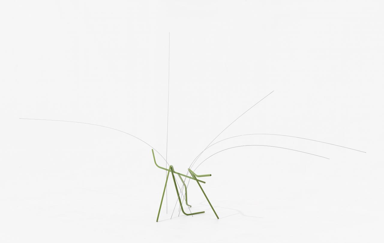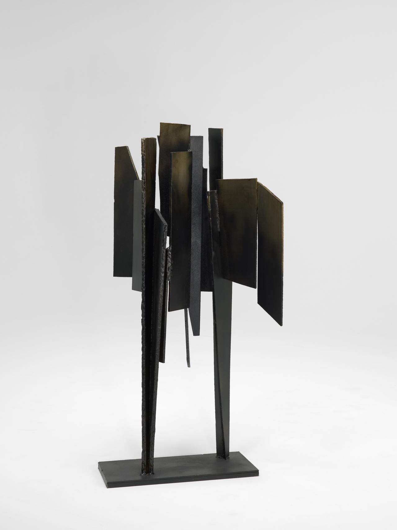 German-born King has worked and exhibited for eight decades, and arrived in Melbourne in 1951 following studies in Germany and Great Britain. Two years earlier she had visited New York; an experience which saw her adopt steel as a medium and begin a new phase in her art-making.3Jane Eckett, ‘Binary star: Inge and Grahame King’, in Inge King: Constellation, National Gallery of Victoria, Melbourne, pp. 13–14. In Winged image, 1964, fragments of steel appear to take on the weightlessness of feathers. Positioned atop two tapered legs, the jagged form is poised to take flight in a manner which belies its physical weight.