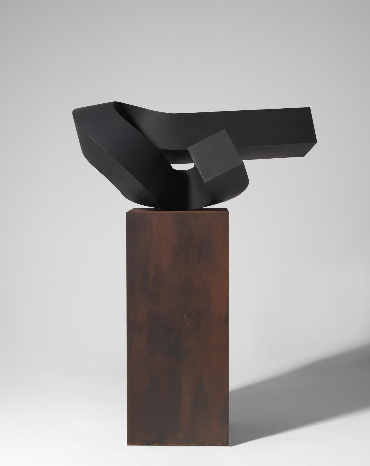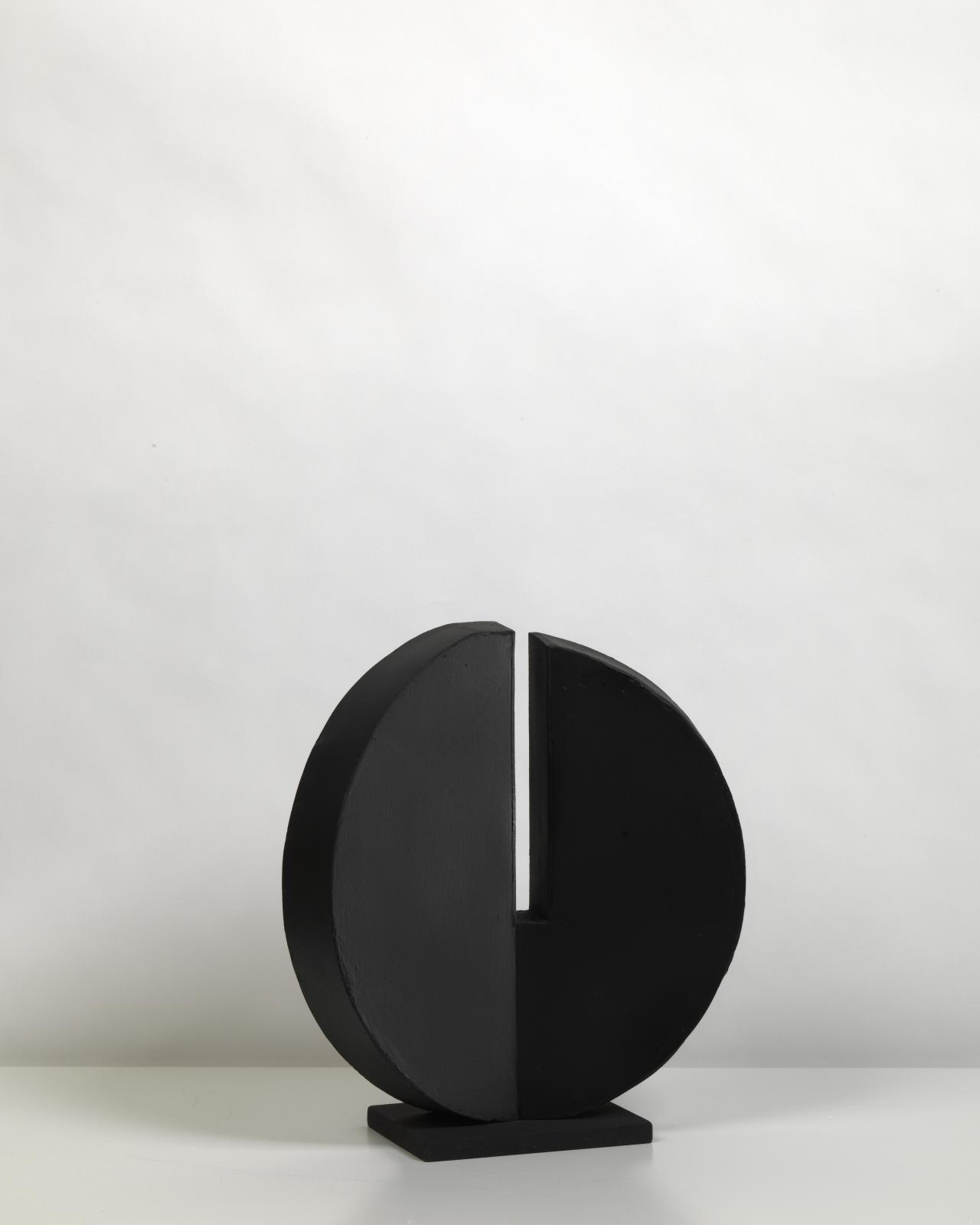 Coated in jet black enamel paint, Black sun, 1974, marked a directional shift in King’s practice. As in Winged image, King imbues her materials with a romanticism at odds with their industrial quality; subtle curves and shifts are coaxed out of uncompromising sheet metal, softening the geometry of the disc. The form is slit vertically, allowing light to pierce through it depending on the angle of viewing.