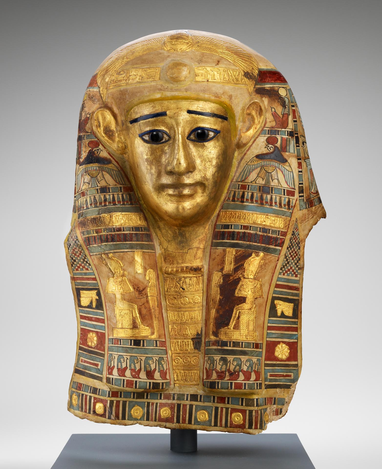 The head covering was placed over the head and upper part of the mummified body and secured with bandages around the lower edge. Made of cartonnage – strips of linen layered and held together with glue and gesso – it has been shaped over a mummiform base and then painted and gilded. The eyebrows and the inlaid eyes incorporate coloured glass.