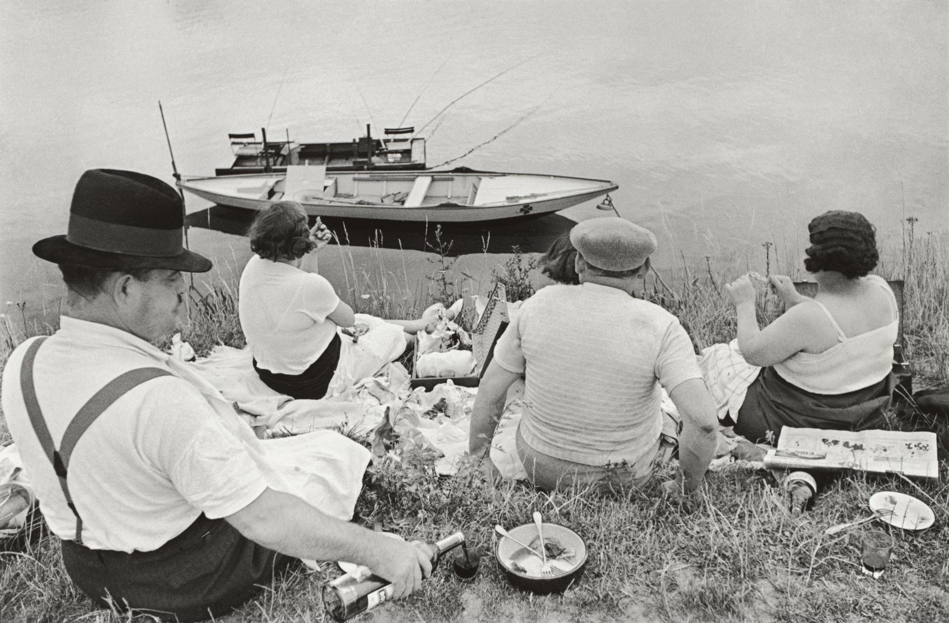 The photographs made by Cartier-Bresson in the 1930s were profoundly influenced by the role of politics and activism in his life. He returned to France in 1936 and began to work for the Paris-based communist press, producing photo-essays for the magazines Ce soir and Regards. As a photojournalist he had less editorial control over his work; he photographed to the briefs of his editors and the ideology they supported. For Ce Soir he was employed to cover political gatherings in Paris, but for Regards his editors commissioned him to document the social outcomes for working people that were only possible under left-wing governments. In 1938 a coalition of the Communist Party and the Radical Socialist Party, known as the Popular Front, was swept into power in France. Shortly after attaining government they mandated two weeks paid leave for all workers. Cartier-Bresson was commissioned by Regards to photograph an extended series that looked at the social impact of this recent change. Juvisy, France, 1938, is part of that body of work. The work shows a group of people picnicking on the banks of the river Marne at Juvisy, a short train ride south of Paris. It captures a moment of easy camaraderie and captures the joie de vivre of relaxing with friends on a warm afternoon, sharing food and wine, and engaging in conversation. Cartier-Bresson’s subjects in this image are shown wearing working-class clothes and picnicking on an unkempt river bank, indicating their social status. Nonetheless, it is a celebratory image, showing a quintessential aspect of everyday life in France, long Sunday lunches, and at the same time illustrating contemporary social and political events.