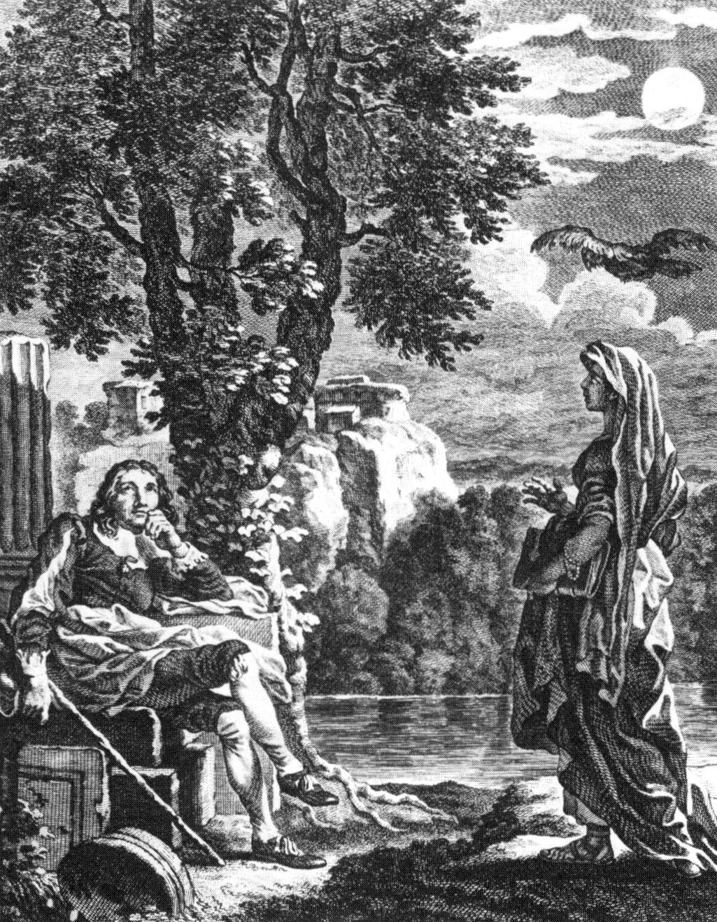 The two fictional women appear in apocryphal stories told of Milton’s youth. The first is set in the poet’s undergraduate days at Cambridge; when he is asleep under a tree, a passing young foreign woman leaves a pencilled note of an Italian verse. On waking Milton finds the note and looks about for the young woman, but she is long gone. Later he goes to Italy and to the end of his days says that the unknown young woman had inspired him to write Paradise Lost.5 David Masson, The Life of John Milton, 1859–80, 6 vols, vol. I, p. 188. He gives as his source Todd, Life of Milton, 1809, pp. 26–27. These legends seem to have been popularised in the late 18th century and derived from both English and Italian sources. When Fuseli mistakenly cited Hayley’s Life…, he was no doubt confusing what he had heard with what he had read. Hayley’s text was in fact an accurate account. This is the legend that Fuseli used for the painting here.