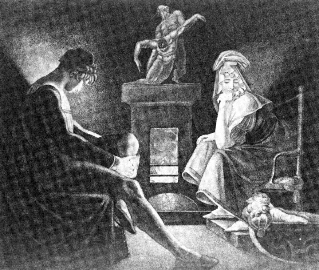 To point up the poet’s melancholy, the artist has placed on the mantelpiece a sculpture group Menelaus supporting the dead Patroclus referring undoubtedly to the poet’s great friendship with Charles Deodati, who died while Milton was in Italy.7 Although no claim is made that Fuseli would know about it, a letter in Greek generally dated 1625, from Deodati to Milton ends with the line from the Iliad, ‘But Menelaus good at the battle cry, came univited’. The letter was in the possession of John Toland, Milton’s biographer.