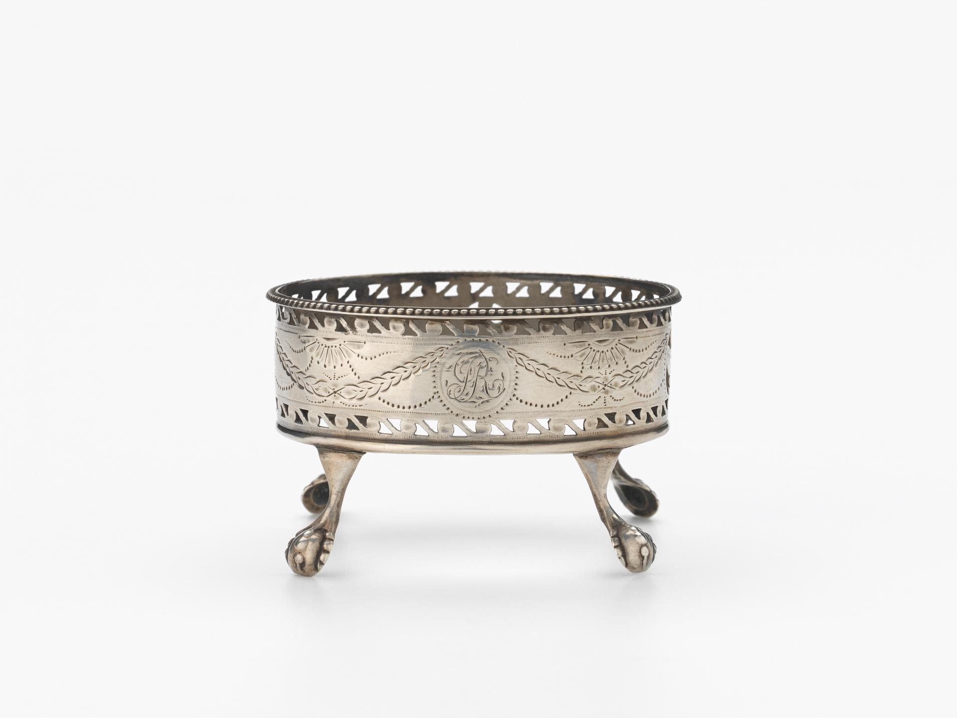 Bateman’s designs reflect the fashionable Neoclassical taste of the late eighteenth century: she used ovals and Classical vase and helmet shapes, along with bright cutting (punching), engraving and pierced ornamentation of foliage, festoons, medallions, shells and diaper patterns. Many works were also edged with minute beading and surmounted with urn finials. The machine processes of punching and piercing, along with the use of factory-made components, allowed Bateman to produce large quantities of objects at accessible prices and ensured a rapid turnover of stock.