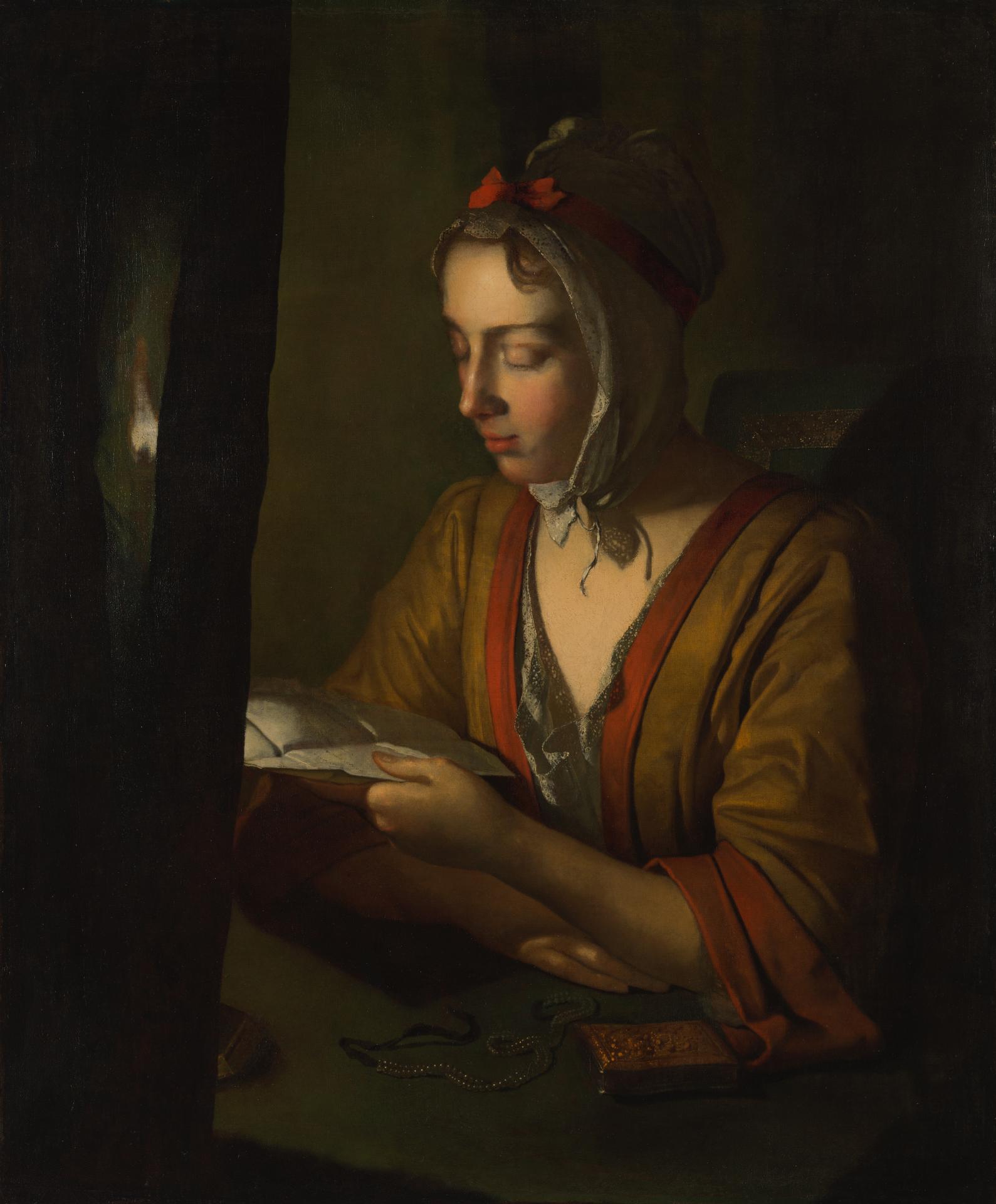 Hidden signature of Herman van der Mijn behind Joseph Wright of Derby’s Anna Romana Wright reading by candlelight c. 1795.