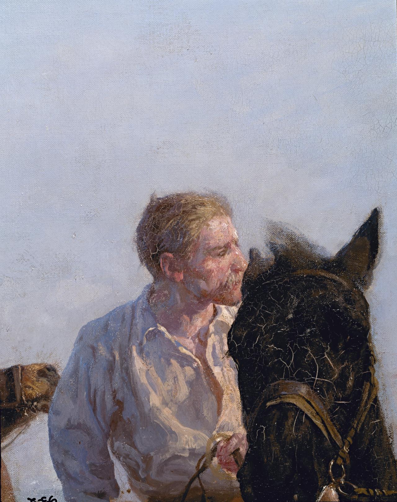 In technique, Horses bathing is very similar to Gypsy horse drovers, 1895, at the Russell-Cotes Art Gallery and Museum in Bournemouth, though there is a notable difference between the two paintings in terms of the appearance of the sky. In my opinion, this is likely to be because the sky in Horses bathing has been repainted. In Gypsy horse drovers the sky is loosely scumbled in a light application of paint consistent with the technique used for the background as a whole, whereas the sky in Horses bathing appears somewhat opaque and heavy. It can be seen in the texture, nevertheless, that the paint has been applied vigorously, so its opacity and weight must be due to the fact that there are two layers. The first application of paint in the sky can be seen at the edges of the picture; it is a duller, more scumbled, blue, similar in appearance to that in the painting in Bournemouth.