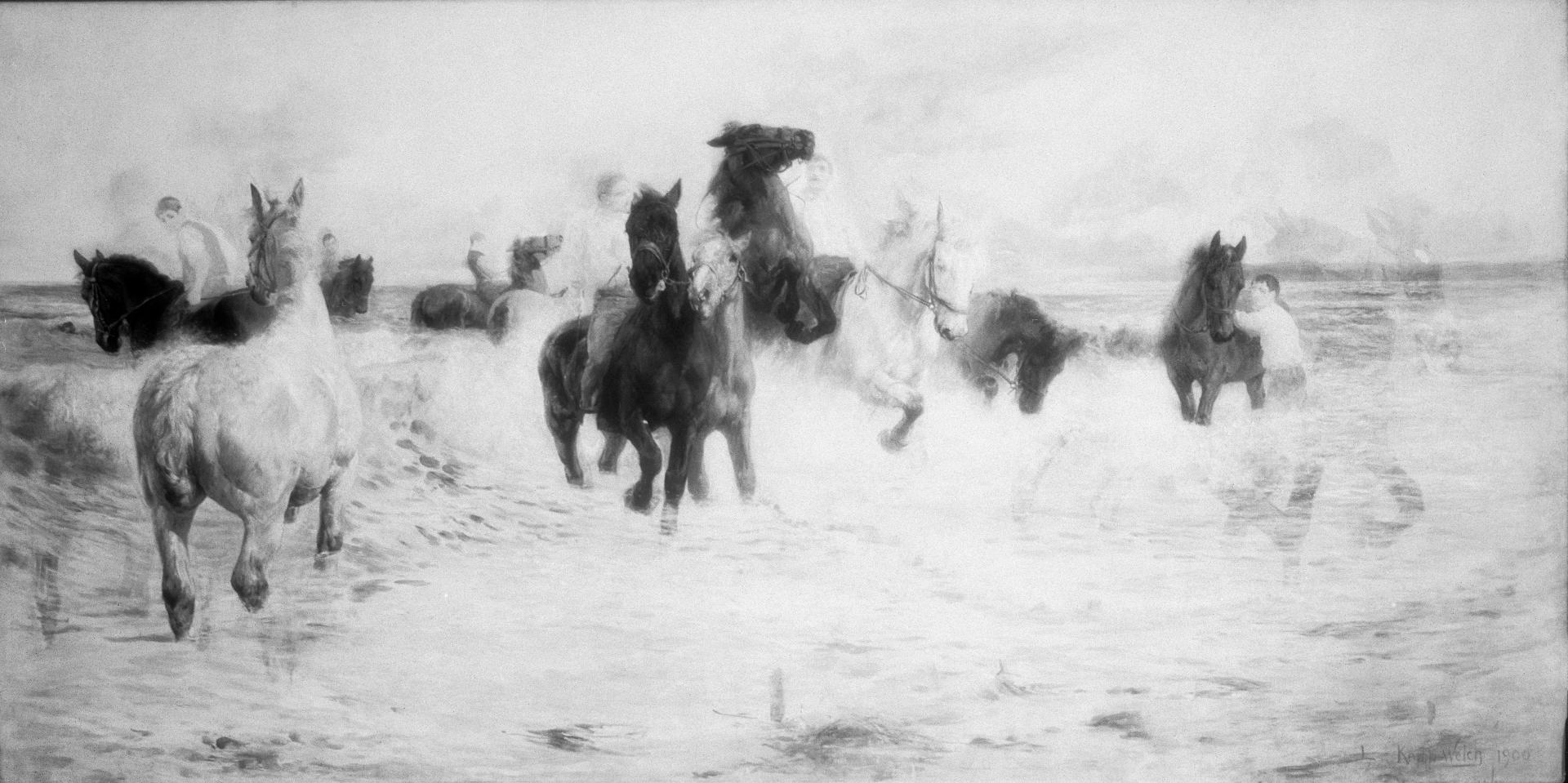 Cleaning has also revealed the artist’s working of the paint layer. It is now apparent that she used a range of techniques to apply the paint, whereas these subtleties were formerly obscured by the varnish. The most freely expressive passages of paint are found in the sea: the foam of the waves has been rendered in a boldly applied impasto of stiff paint, which contrasts heavily with the flat paint around it; the seaspray and the foam on the shore have been suggested with dry brushwork; and sgraffito, apparently achieved with the brush handle, is seen in passages of water beneath the central horses. The artist’s rendition of the central white horse also exemplifies her confident handling of paint: the neck has been rendered in an application of fluid paint, while the nose has been applied in paint of a stiffer texture, the artist having added small flecks of various colours; the eye and lashes are ‘drawn’ in fine lines; and the bridle is loosely but accurately painted. The handling of this horse exemplifies, too, the artist’s use of ‘the small amount of actual white and the warm, green colour of the shadows’.9Lucy Kemp-Welch, note, Kemp-Welch papers, private collection.