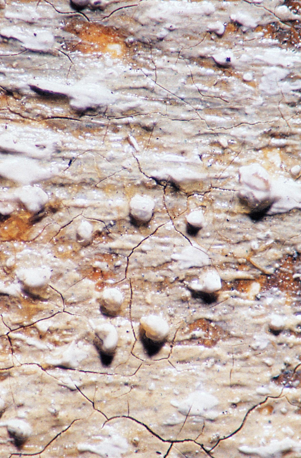 Nevertheless, when examining the surface of Horses bathing under the stereo-microscope one does find conspicuous material evidence that the work was executed among the sandhills – particles of sand, which would have adhered to the surface while the artist was painting, are embedded in the paint layer. In many areas the sand has caught, or is covered by, subsequent applications of paint, and sits between paint layers rather than on the surface (fig. 4). The fact that sand can be found beneath layers of paint is consistent with the work’s having been later altered indoors, in the studio.