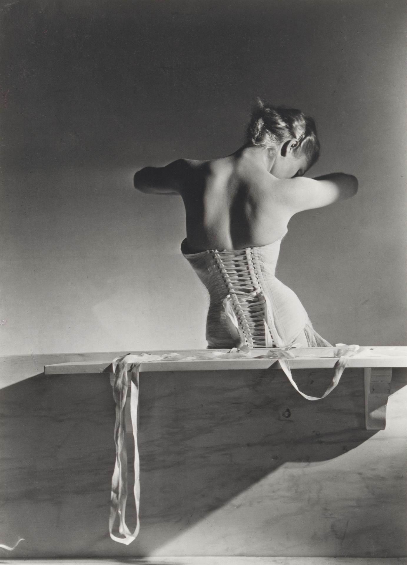 Mainboucher corset shows his model posed with her back towards the camera, revealing the details of the intricately laced ribbons and silken fabric of the corset. Horst’s signature lighting technique, employing deep shadows and luminous highlights, emphasises the model’s finely muscled form, repositioning her from the role of thoroughly modern woman to that of living ‘classical’ sculpture. His setting for this photograph is elegantly simple, a plain marble balustrade bisecting the image which effectively juxtaposes cool stone and warm flesh. In this sensual image the model is self-contained, her gaze is averted from the viewer, and the partially laced ribbons of her corset flow in tangled skeins over the edge of the balustrade. Horst once noted, ‘My best pictures always have a little mess’. In this photograph his artful ‘mess’ is the perfect counterpoint to the seeming perfection of both model and garment