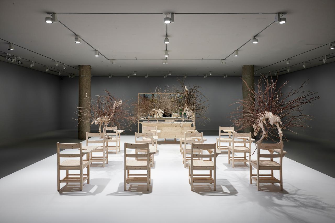 HH The viewer might not realise it, but yes, I chose to use a dodo skeleton as it’s one of the first animals you learn about that went extinct because of humankind. This work was made right as COVID was ending and so the classroom can also be conflated with some sort of idea of extinction, because a lot of people thought everything would go online. At the NGV, it’s presented on a plinth. The whole thing is an object. In fifty or a hundred years it’s like, this is how humans educated themselves, in this sort of classroom. It’s funny just to show the whole classroom as this thing of the past.