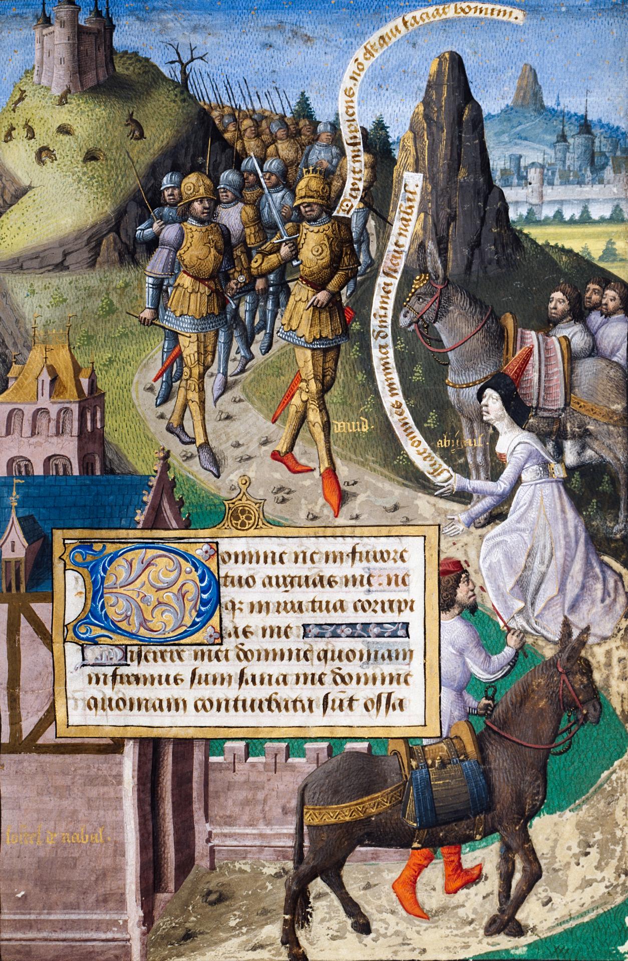 The penitential psalms were regularly illustrated by a composition of David. He is often shown kneeling in prayer with harp or lyre beside him, and in the Dijon book, we see him thus (fig. 8). Again, Maître François injects a more lively and unusual narrative element into the corresponding Wharncliffe miniature (fig. 9). The scene depicted is that of David encountering Abigail, as he struts aggressively in front of his troops. This is an exceedingly rare, though appropriate, choice of theme for this section of a Book of Hours. Abigail went forth to placate David’s anger against her husband Nabal. She was consequently interpreted as a symbol of mediation and a pre-figuration of the Virgin, averting the divine wrath by her pleading. This is an apt illustration, therefore, for the penitential psalms whose central theme is a plea for mercy and forgiveness.