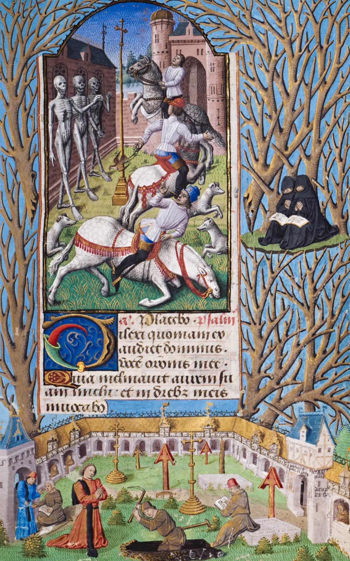 The Dijon Vigils of the Dead are introduced by a Funeral Service, again a well-established illustration for this text. The corresponding Wharncliffe page is more dynamically oriented (fig. 10). Its main miniature presents the dramatic encounter of the Three Living and the Three Dead – a popular legend which had already been used by the French painter and miniaturist Jean Fouquet. The total decoration of the Wharncliffe page includes more unusual elements: a border of gold, leafless branches replaces the regular floral acanthus pattern, and in a subsidiary scene along the lower margin a kneeling figure ponders his mortality beside a grave which is being freshly dug.