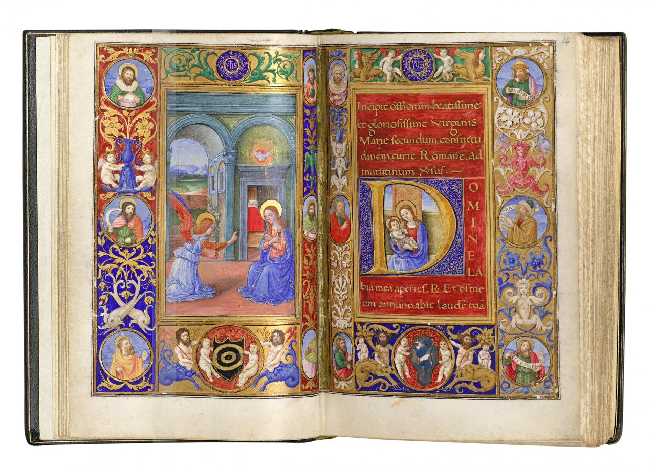 This Book of Hours proudly bore the arms of its first owners, although it seems to have changed hands very early. The arms of the Strozzi and Acciaiuoli originally appeared on ff.16v and 17, but those of the Albizzi were then painted over the Strozzi. It has been suggested that the book may have been commissioned in anticipation of the marriage of Filippo Strozzi’s niece, Lucrezia di Lorenzo Strozzi, to Robert de Donato Acciaiuoli. The latter’s Albizzi wife died in 1496. Thus there must have been a sudden change in ownership very shortly after the completion of the manuscript, or even possibly during its production.