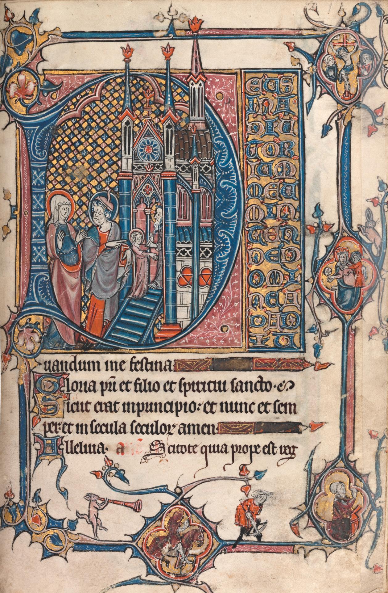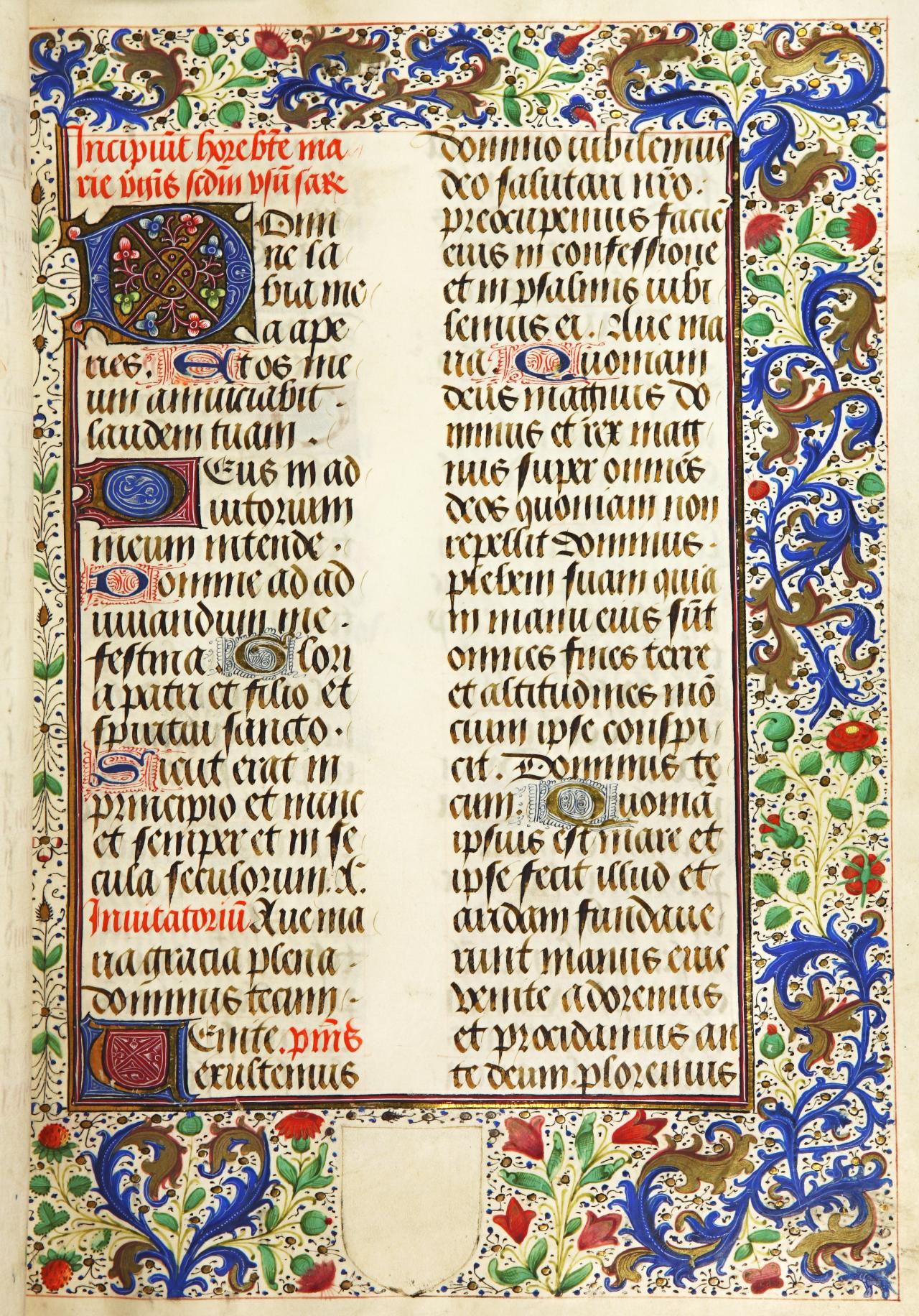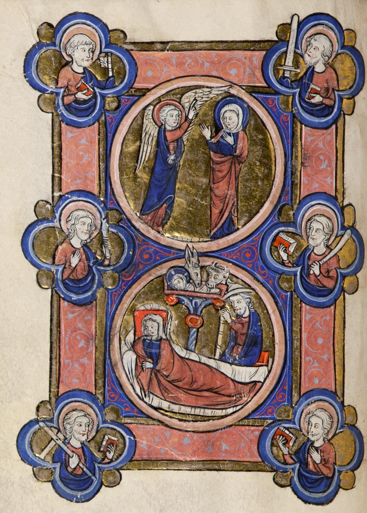 The Aspremont manuscript, in addition to a psalter, liturgical calendar, canticles and litany (Oxford section), contains five full Offices for the feasts of Christmas, the Purification, Annunciation, Assumption and Nativity of the Virgin. Unlike the Liège book it does not have a version of the Little Office, nor does it include any other supplements or local devotions. Indeed, although produced some thirty years later than the Liège book it has closer links with the breviary than with a Book of Hours.