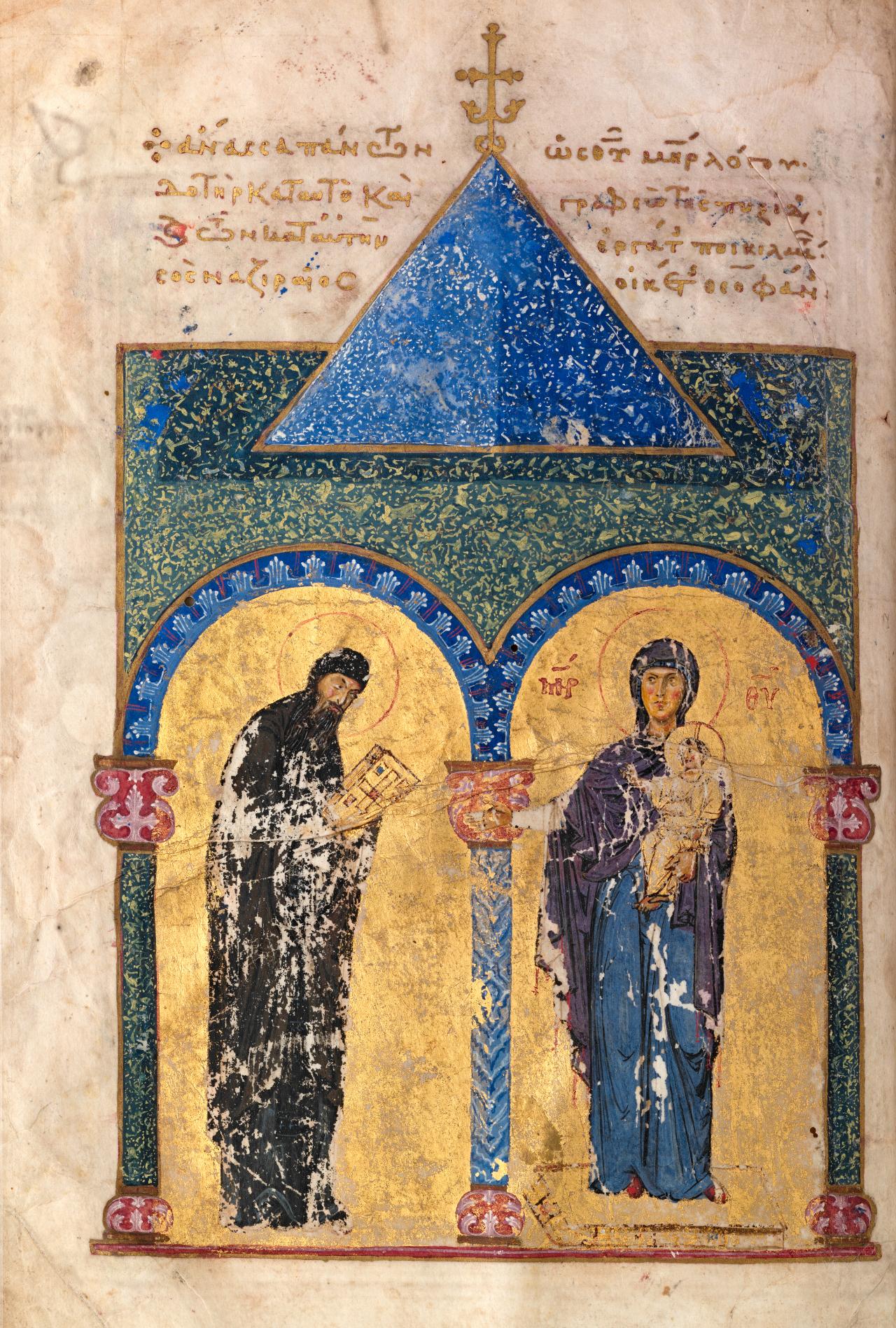 Still more singular is the elaborate frontispiece to the manuscript in which a tall, dignified monk presents the gospels to a majestic image of the Virgin and Child (fig. 2). An accompanying gold-lettered inscription provides identification: ‘O Queen of all as mother of the Divine Word, the donor and writer of the book and painter of the pictures in it is your servant the consecrated Theophanes.’ Scribes, both Eastern and Western, not infrequently signed their manuscripts, but it is rare indeed to find explicit reference to the author of the illumination, and it is still more unusual for the scribe-illuminator to be depicted in a full-scale composition. This frontispiece, moreover, is a fine piece of painting in its own right. The Virgin, with regal stance supporting a blessing Christ Child, is of the Hodegetria type, which occurs in both icons and mosaics as a symbol of the majesty of the church and of its important mission as the guide to Christ. In the miniature the only modification of the traditional iconographical format is the gesture of the Virgin’s right hand, which stretches out to receive the gold and jewelled-studded book presented by Theophanes.