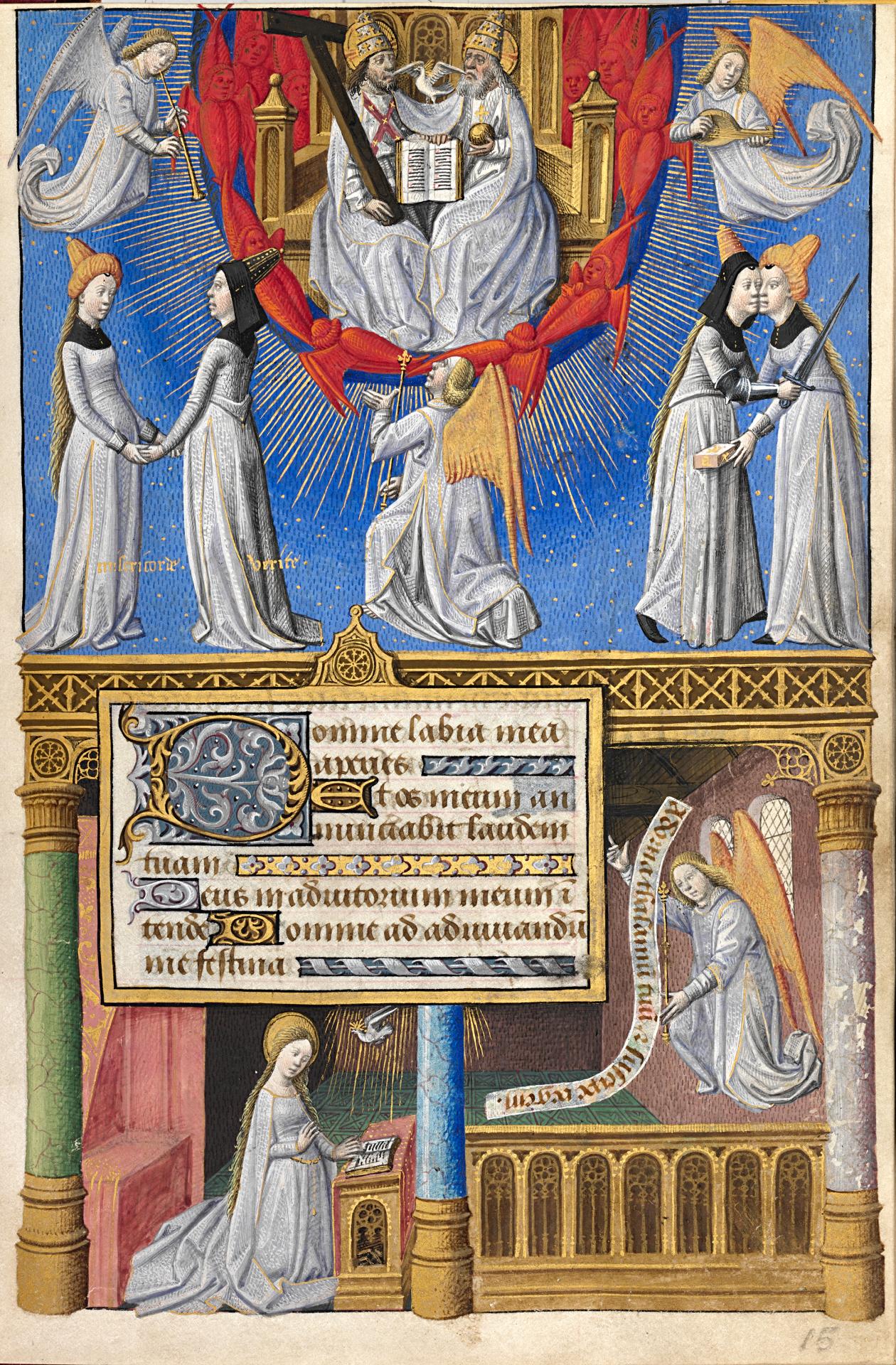 Elsewhere in the Wharncliffe Hours, Maître François further demonstrates his ability to infuse traditional themes with fresh narrative verve or contemporary commentary. By this time, it had become a customary practice in many French workshops for the miniature of the Annunciation which introduced the Hours of the Virgin at matins to be highlighted as the most important composition of the entire book. Maître François presents the Annunciation within a contemporary dramatic context (fig. 11). He draws directly on the Mystery Play of the French theologian Arnoul Gréban and shows the virtues Mercy and Truth, Justice and Peace, reconciled in the Court of Heaven as a result of the Incarnation, life, death and the Resurrection of Christ. The opening and closing scenes of Gréban’s play are telescoped in this introduction. Gabriel is shown in Heaven, kneeling to receive his commission, and in the scene below announcing the Incarnation to Mary. The Virtues are already reconciled – something which takes place in the play at the conclusion of Christ’s life after his triumphant Ascension into Heaven. This scene appears in several late fifteenth-century French manuscripts, all of which are associated with the school of Maître François, who was clearly responsible for devising the composition and applying it to the Book of Hours.