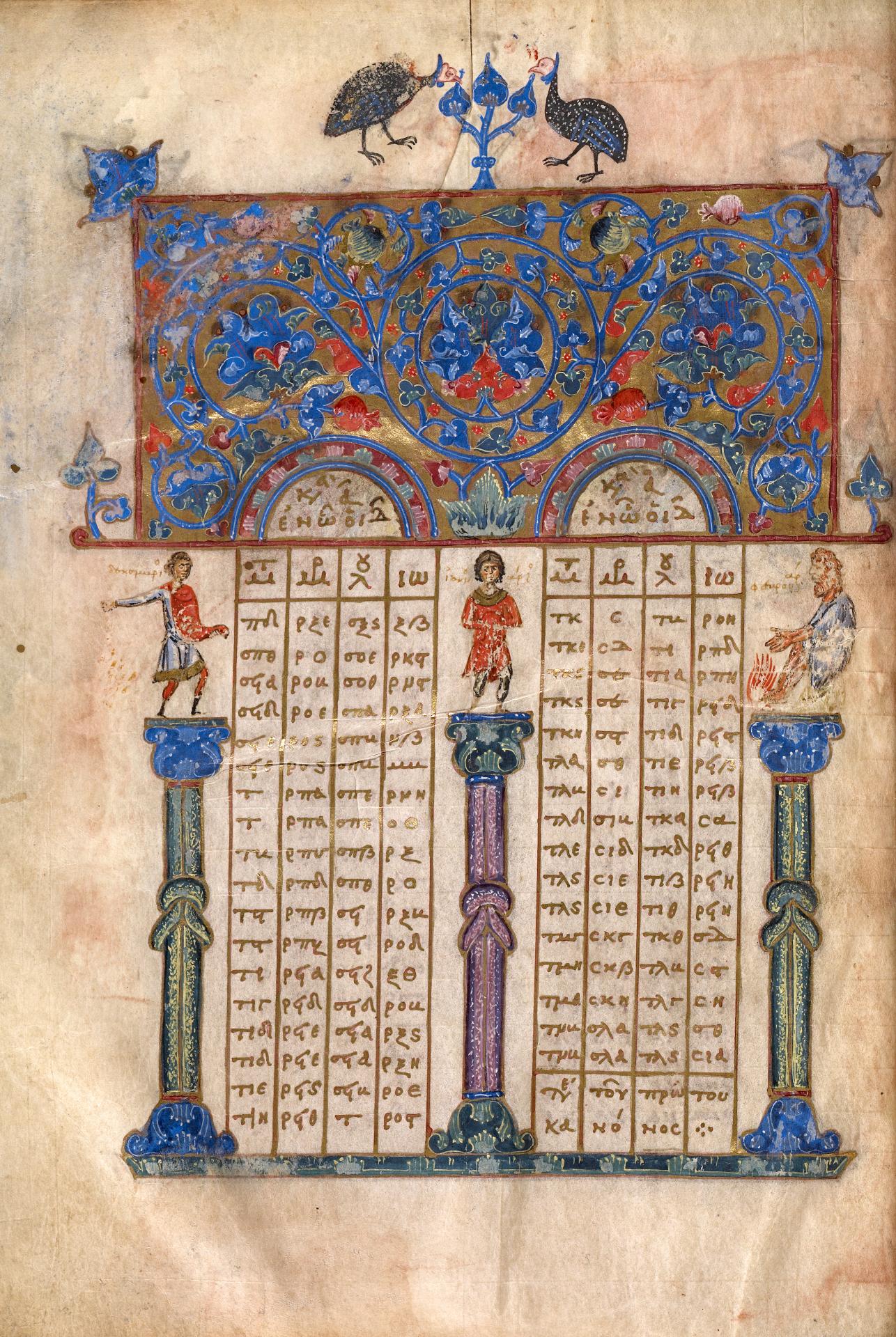 As accomplished scribe and illuminator, he also exercised a certain freedom in the decoration of the Canon Tables with the labours of the months and virtues. Both these sets of images follow established Byzantine patterns to be found in other types of manuscripts and artistic media. Transposed to the Canon Tables they acquire a sharpened allusive edge. The calendar figures attest to the pervasive presence of the gospels through the passage of time, and their appropriateness for all seasons. The virtues are personal in emphasis: prudence, courage, thoughtfulness, alms-giving, well-doing, kindness of heart, exhortation, repentance, love, wisdom, contemplation and action. Juxtaposed with the calendar figures, they call for the living-out of the gospel ideal within the monastic environment.