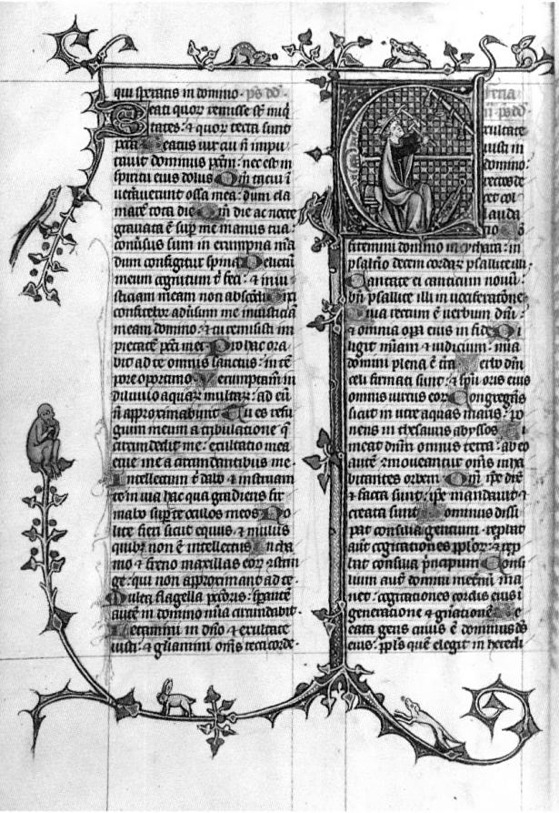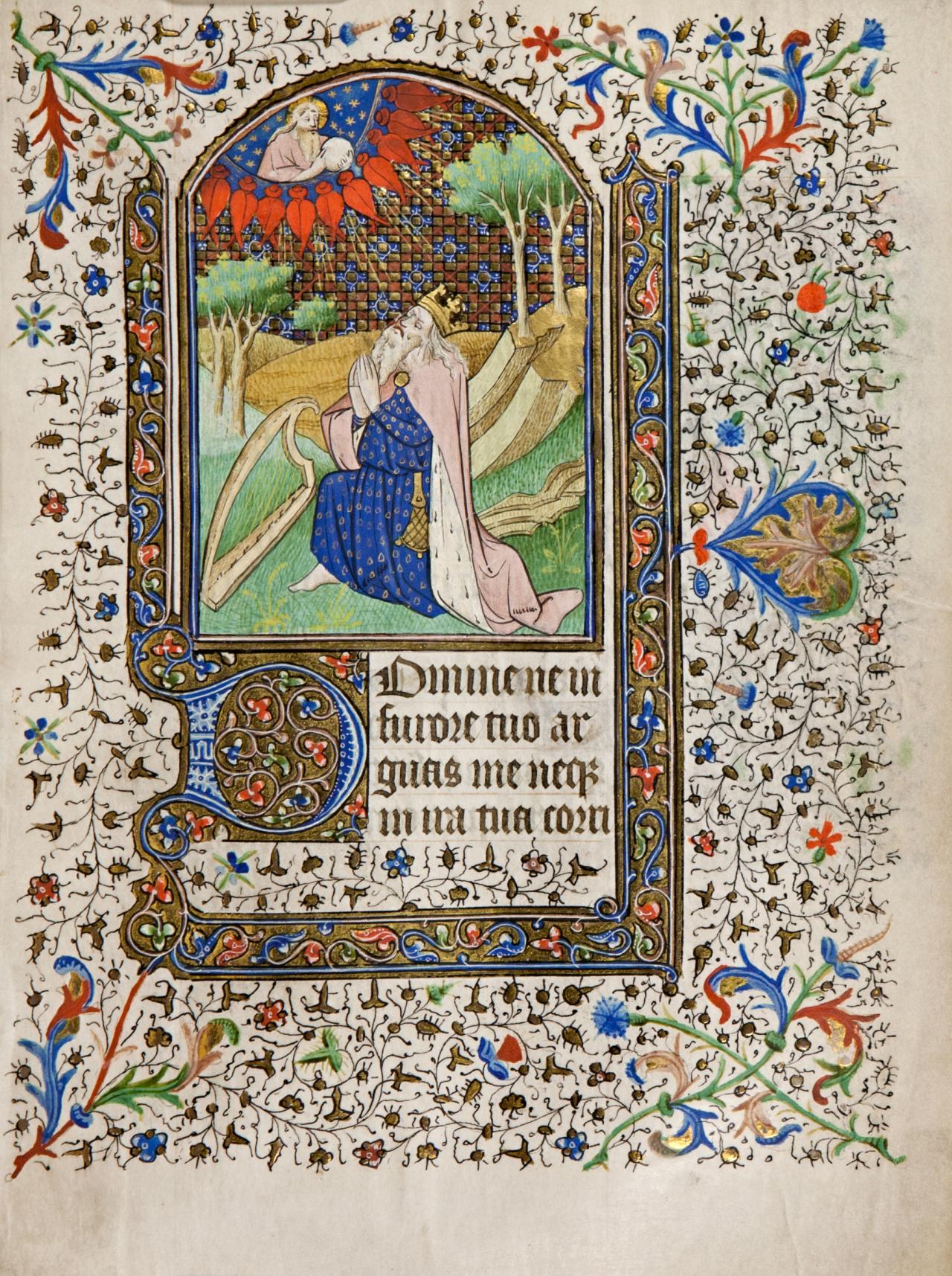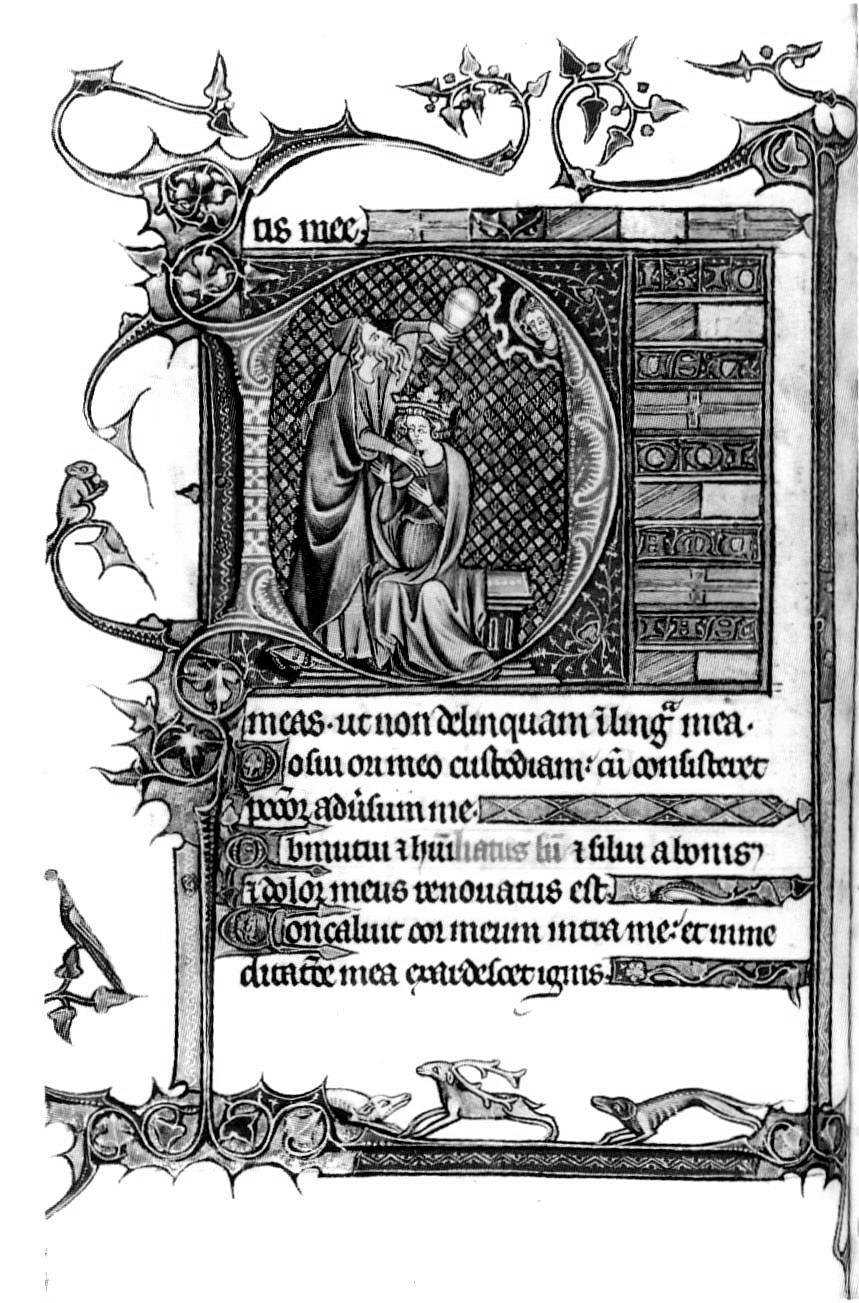 In the Divine Office the psalter was divided so as to provide for the recitation of the complete sequence within the course of one week. These liturgical divisions are reflected in the series of historiated initials which introduce certain psalms in both the Liège and Aspremont psalters. In the Liège psalter, however, two visual traditions are combined: a literal interpretation of the first words of the psalm, together with references to David as the received author of the psalter, with scenes from the life of Christ; in the Aspremont psalter the literal–Davidic pattern is adhered to throughout (fig. 4).