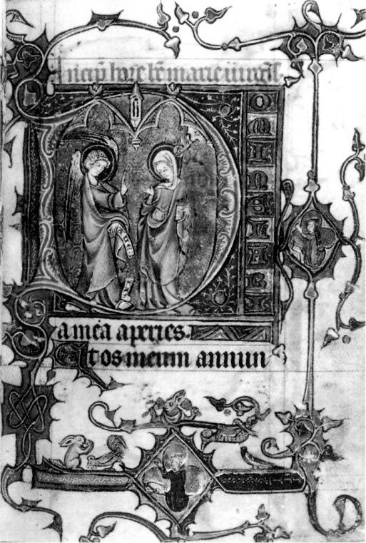 The Aspremont Psalter-Hours is a more personal commission. Textually, it seems to have been custom-made. I know of no other manuscript which duplicates its contents. Its illumination also, we have seen, makes many specific references to the original patrons. Joffroy d’Aspremont belonged to a noble family who owned lands in Namur and the Lorraine. They were related through marriage to the de Bar family, prominent in the history of Church and State at this time. Joffroy d’Aspremont’s son Gobert married Mary de Bar, the sister of Renaud, canon of Verdun and later bishop of Metz, and of Marguerite, Abbess of the Benedictine Convent, Saint-Maur, in Verdun. These family links are relevant, since the Aspremont Psalter-Hours is closely related stylistically to a breviary (fig. 6), which was probably executed for Marguerite de Bar when she was Abbess of Saint-Maur. A Book of Hours in a private collection (fig. 7) also belongs to the same workshop.4Lot 77, Sotheby’s Sale, 3 July 1984; see Sotheby’s Sale Catalogue, pp. 102–11. This style has some links with a well-established school of illumination at Metz which produced several fine liturgical manuscripts for Renaud de Bar. It is none the less distinctive and probably issues from a workshop in Verdun with more entrenched local elements. On f.142 of the psalter section of the Aspremont book, the illuminator has left his signature. A tiny figure, held in the beak of a marginal grotesque, holds out a scroll on which are written the words: ‘Nicolaus me fecit qui illuminat librum’. Clearly Nicolaus and his fellow illuminators were called on to produce a variety of manuscripts, ranging from strictly liturgical manuals through to individually tailored breviary-extracts and the more modern Book of Hours, for a clientele which embraced clerical, monastic and lay members of the local nobility.