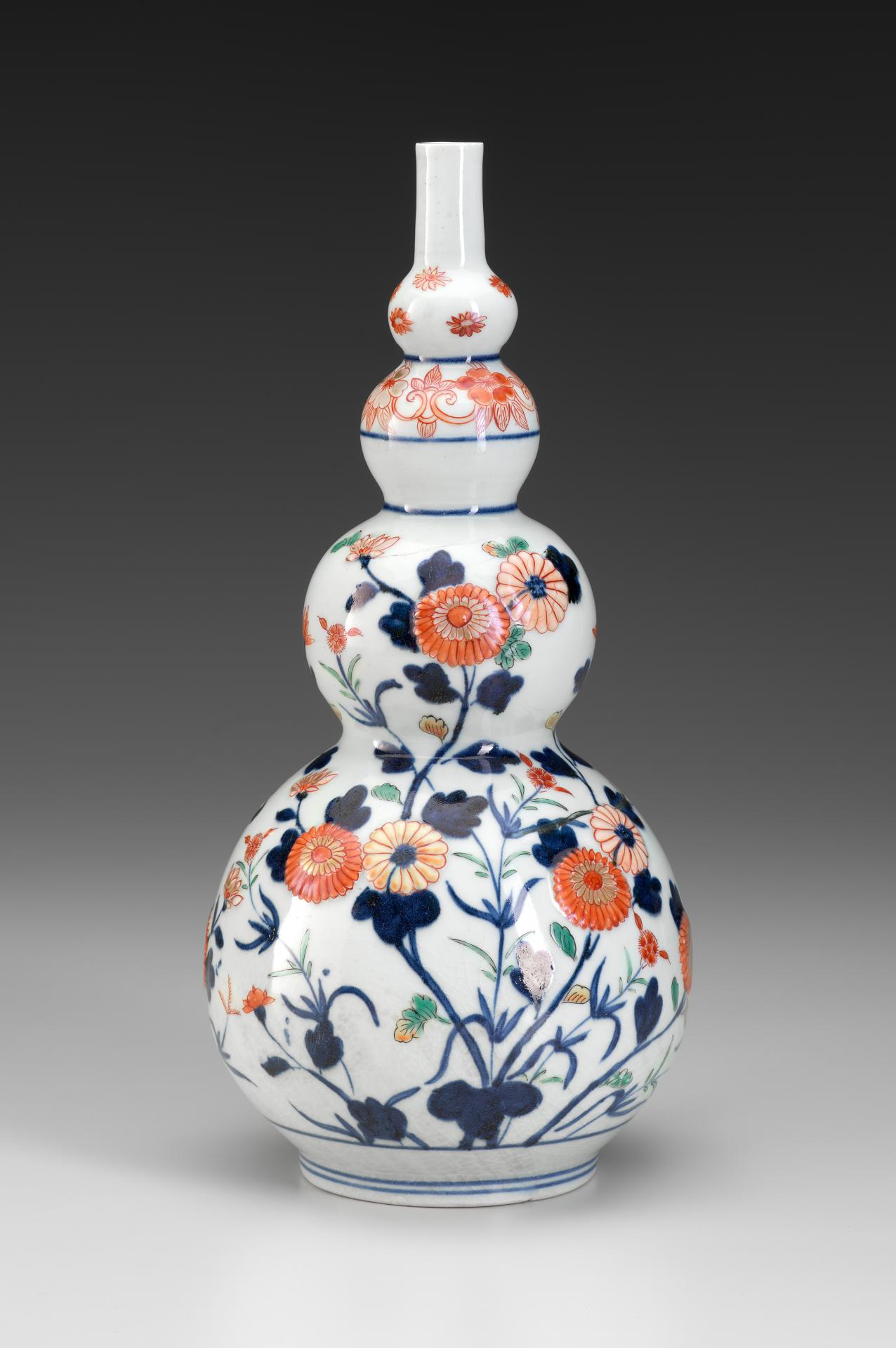 During the seventeenth, eighteenth and nineteenth centuries the reclusive island nation of Japan became internationally recognised for one treasured product beyond all others: Imari porcelain. White porcelain bowls, plates, bottles, utensils and ornamental figurines, exquisitely finished with translucent glazed colours and gold enamels, were distributed throughout Japan and beyond to the cultural centres of Asia and Europe. Decorated with birds and flowers alongside auspicious symbols and mythological animals, Imari ware appealed to the Japanese love of the natural world and belief in the supernatural, while Imari’s highly decorative designs, floret shapes and use of gold to enhance exotic colourful designs enchanted the aristocratic classes of Europe and the rulers of Asian kingdoms.