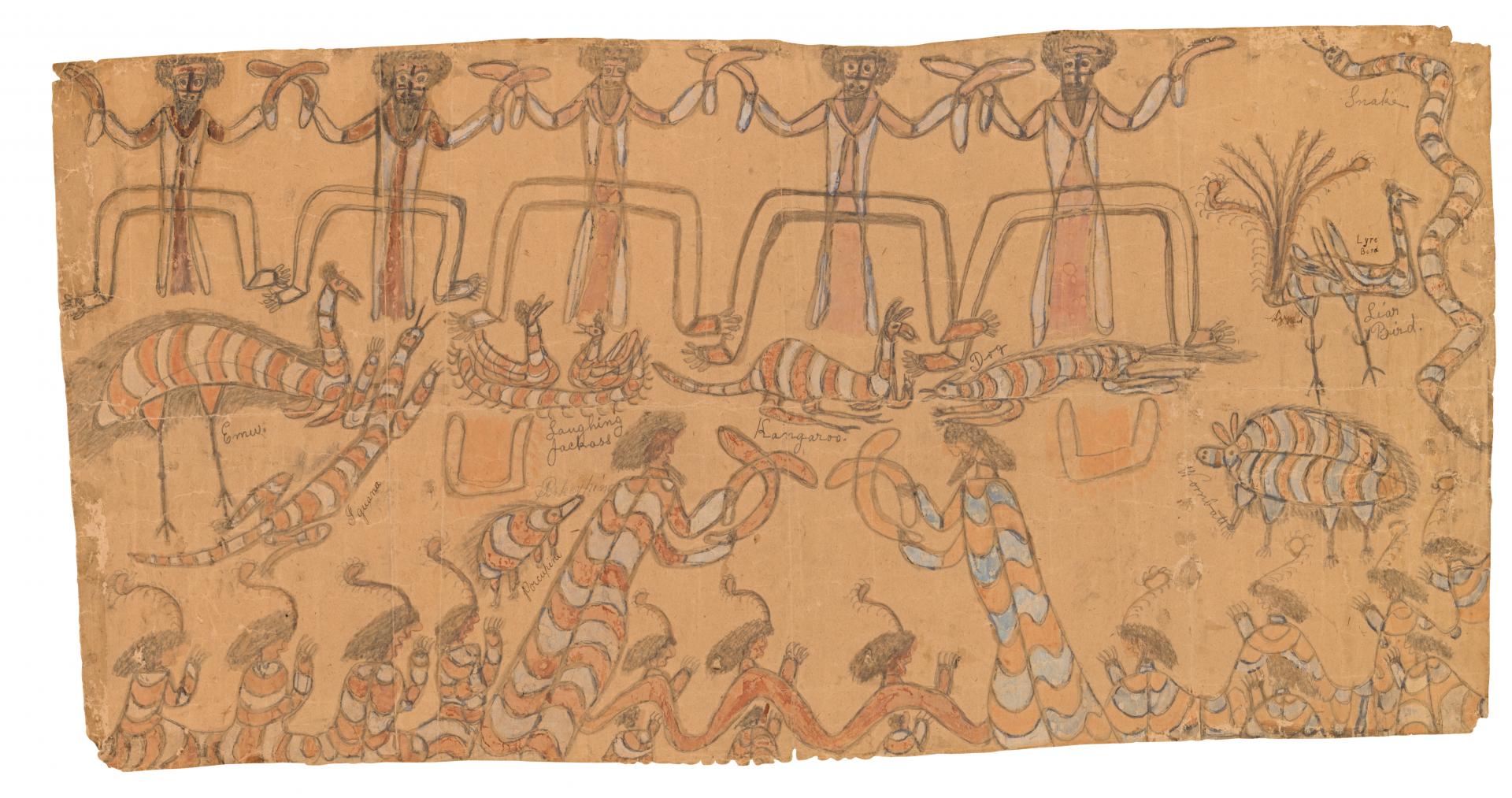 The middle ground contains two small campfires but is dominated by an extraordinary range of native birds and animals: echidna, kookaburra, goanna, kangaroo, emu, lyrebird, dog and snake. Interestingly, some of these are identified by written inscriptions, illustrative of the original owner’s interest in taxonomy. Some of the animals are given European names – iguana instead of goanna, and porcupine rather than echidna – and occasionally spelling mistakes are corrected by a later inscription. The bodies of the birds and animals are patterned with linear meanders similar to those found on the possum-skin cloaks. It is possible that these creatures elaborated with totemic markings relate to songs and dances performed at the ceremony.
