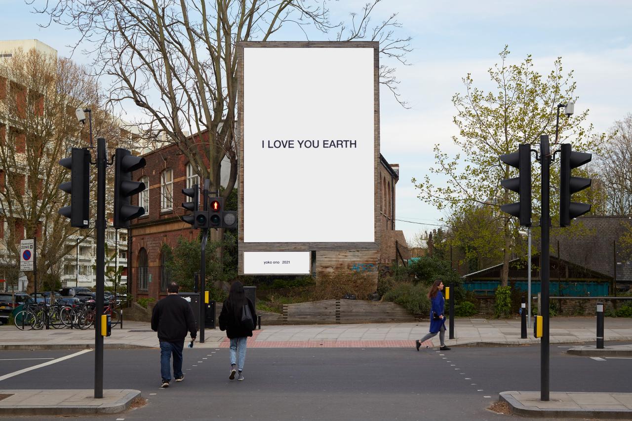 The Yoko Ono poetic voice is always performing, though often silently. The declaratively all-caps, lyric-as-lyricpoem text work I LOVE YOU EARTH, 2021, takes the form of public billboards and banners across cities and public spaces, including, for the Triennial, on the facade of the National Gallery of Victoria. I LOVE YOU EARTH is also the title of a song on Ono’s 1985 album Starspace.