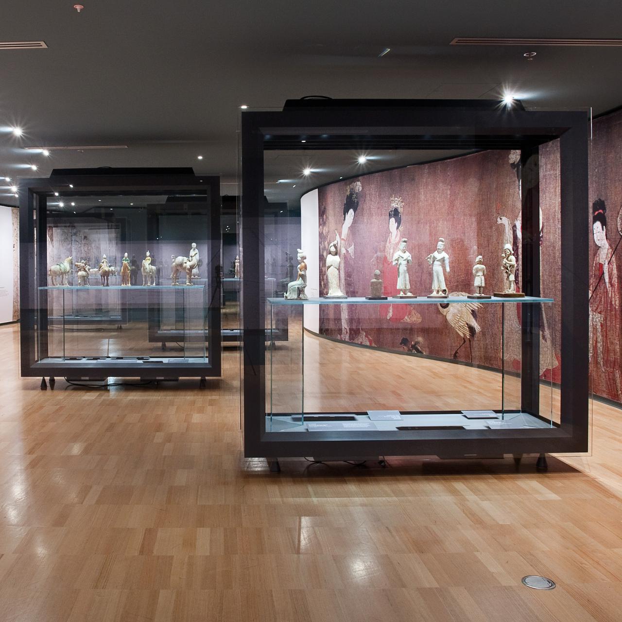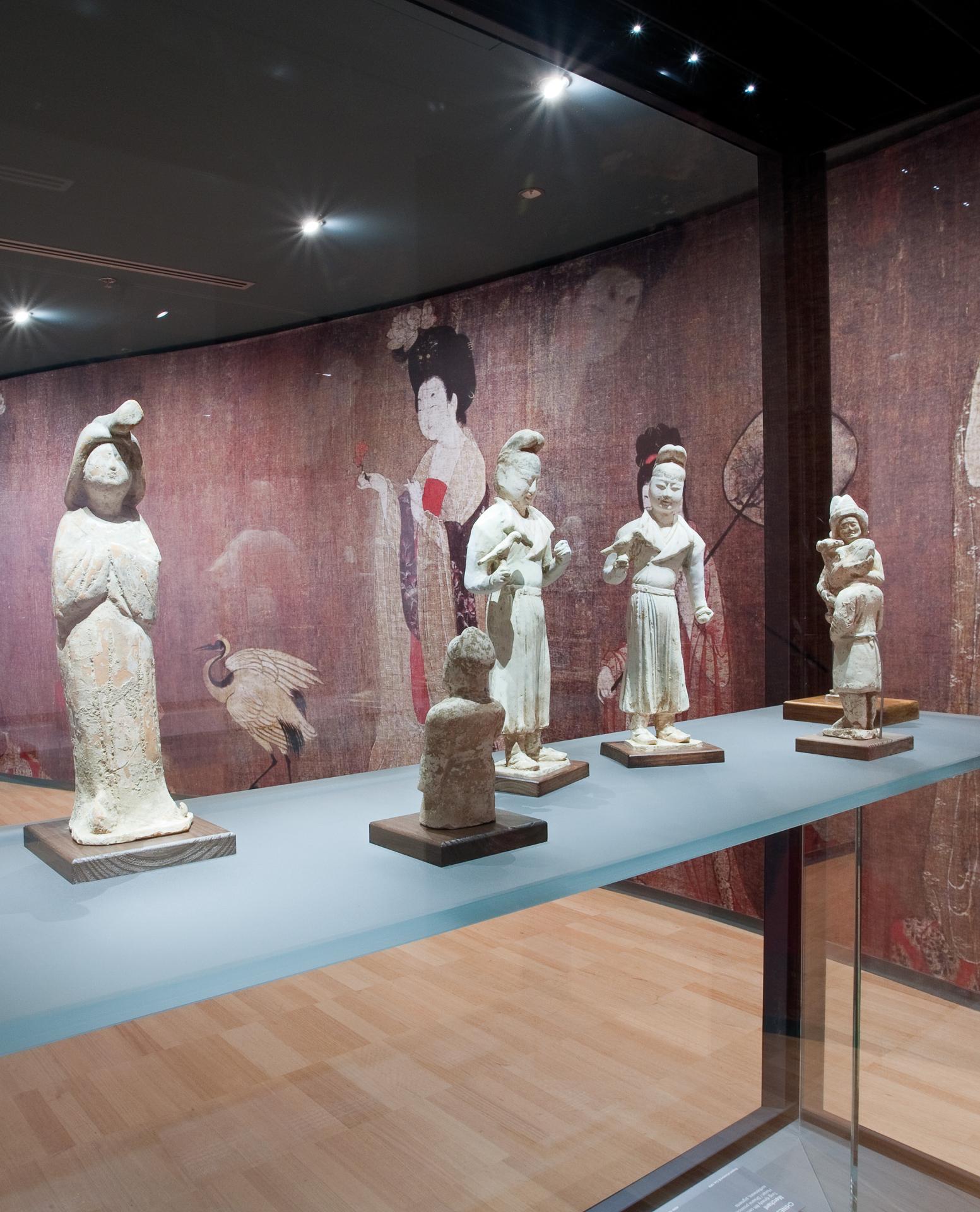 Ceramic figurines are displayed in independent cases in the space between the two undulating walls, which display floor-to-ceiling, cloth reproductions of magnificent wall paintings from two important Tang dynasty tombs. These paintings not only relate to the figurines on display but also serve to envelop the viewer in the art of particular tombs.