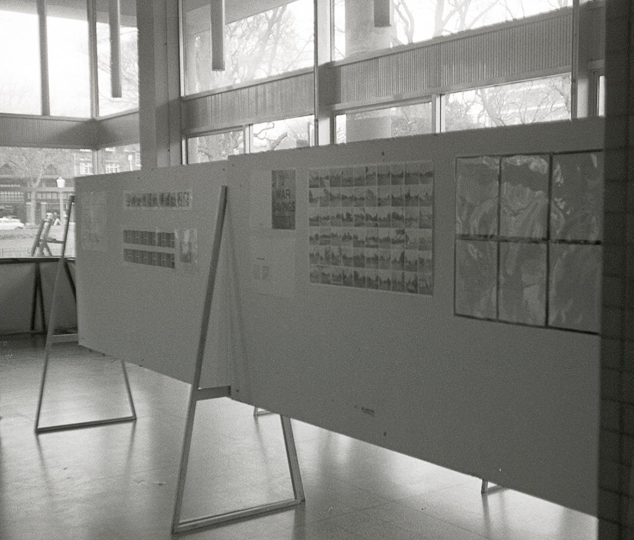 In January 1972 Rooney mailed seven recent photo-works, along with two printed works, to Cutforth, all of which were displayed, except for Miami Street, Dec 1971, 1971 (‘photos #10 & 11 missing and two #15’s, so I haven’t mounted it’).29 The photo-works sent by Rooney included Scorched almonds, Jul – Aug 1970, 1970; Anzacs, Jul 1971, 1971; Meals, Jul – Aug 1970, 1970; 10.8 miles in 44 minutes, May 1971, 1971; Holden Park 1, 1970; Variety, 1971; and Miami Street, Dec 1971, 1971. The printed works were War savings streets, 1970, and Words and phrases in inverted commas in the collected works of IBMR, 1972. On receipt of the missing works a few weeks later, Cutforth wrote to Rooney of displaying Miami Street, Dec 1971 as part of the Brighton Polytechnic exhibition, although the work is not visible in photographs of the installation. See Cutforth, letter to Rooney, 14 Feb. 1972. The installation negatives sent to Rooney a few weeks later show the neat display of the works, wrapping around the partition stands, with an introductory ‘didactic’ text containing biographical details about Rooney (fig. 5a-c).30 Cutforth also described the specific installation method used: ‘Your photo-work at Brighton; I mounted it with photo-mounting corners onto sheets of cardboard. Then covered these with thin clear plastic sheets, turned over at the edges, and cellotaped to the back of the card. It gives quite a good temporary (or semi-permanent) presentation’. Cutforth, letter to Rooney, 13 March 1972.