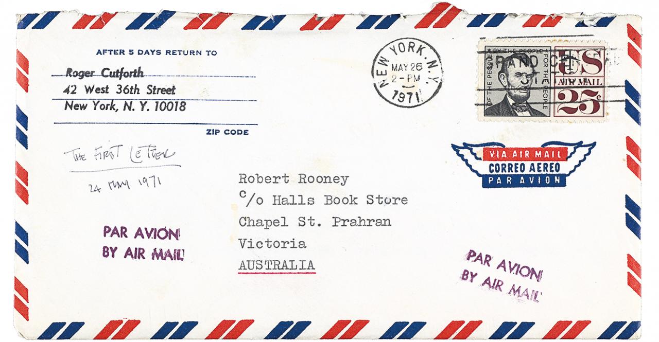 In May 1971 Roger Cutforth, a British-born, New York-based conceptualist artist, wrote to Robert Rooney in Melbourne. THE FIRST LETTER, as Rooney inscribed on the envelope (fig. 2) before it was filed within his personal archive, marked the beginning of a seven-year period of written dialogue between Cutforth in the United States and England, and Rooney in Melbourne, during which they never met in person. Their correspondence demonstrates a complex information exchange based on a shared interest in conceptualism and photography.1Rooney also wrote and received letters during this period from a range of other artists (such as Ian Burn, Mel Ramsden, Mel Bochner, Ed Ruscha, Vito Acconci, Sol LeWitt and Dale Hickey), but it was the letters from Roger Cutforth which formed the most sustained, significant and influential correspondence. While the association between Rooney and Cutforth has been acknowledged before, this article will present a fuller account of their international dialogue2 See Charles Green, The Third Hand: Artist Collaborations from Conceptualism to Postmodernism, University of Minnesota Press, 2001; Ann Stephen, On Looking at Looking: The Art and Politics of Ian Burn, Miegunyah Press, Melbourne, 2006. with particular focus on its early years, between 1971 and 1974, the most intense period of communication, coinciding with each artist’s concentrated engagement with first-wave conceptualism.