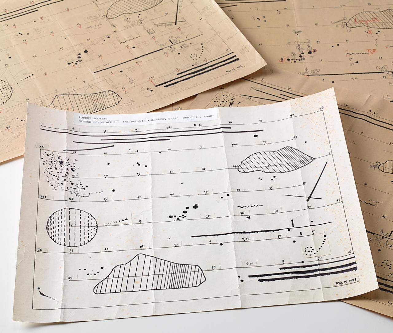 On 31 January 1972 Cutforth wrote: ‘I have the negs for your N.E.W.S. taken at a [friend’s] address and am including the work in the [Brighton] show, will send them with installation shots’.40 Cutforth, letter to Rooney, 31 Jan. 1972. Although it is not clear whether Cutforth did in fact include the London version of N.E.W.S. in Rooney’s exhibition at Brighton Polytechnic, the process of mailing instructions to Cutforth is demonstrative of a type of authorial displacement in which Rooney provided the concept and parameters for the work, allowing Cutforth to execute it remotely. In this way, N.E.W.S. followed the process of Rooney’s earlier graphic scores, such as Second landscape for instruments (Slippery seal), 1968, which incorporated elements of controlled chance and encouraged other artists or performers to interpret and execute the abstracted scores (fig. 8).
