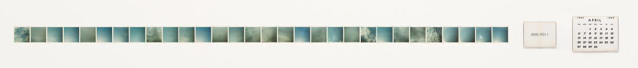 Cutforth’s connections to Australia originated through his friendship with Mel Ramsden, who introduced him to Melbourne-born Ian Burn when the three young artists were living in New York in 1968.7 For detailed information on this partnership, see Green; Stephen. By the summer of that year the expatriates were ‘loosely associated through the exchange of art ideas [and] practices’, and in the early months of 1969 their friendship evolved into a more concrete partnership as the Society for Theoretical Art and Analyses (referred hereafter as the Society), a framework for distributing work and mutual ideas.8 Cutforth, questionnaire by Finch and Homewood. In 1968 Cutforth produced his first purely conceptual work, entitled ABC of painting. Consisting of three large photostat panels, it reduced the idea of painting to an enquiry into the nature of art, and explored the relationship between visual references and the objects themselves through the presentation of a sequence of ideas and referents. Burn and Ramsden were independently, and simultaneously, engaged in the investigation of increasingly dematerialised and theoretical new art and language. Melbourne audiences had also been exposed to Burn and Ramsden’s works in The Field exhibition held at the National Gallery of Victoria in 1968. It was through Burn that Cutforth came into contact with Bruce Pollard, the pioneering director of Pinacotheca gallery in Melbourne. Burn wrote to Pollard in January 1969 with a proposal for an ‘exhibition of ideas’ which could be shipped from New York to Australia by mail.9 Ian Burn, letter to Bruce Pollard, 29 January 1969, Pinacotheca archive. Following Pollard’s positive response, Burn proposed the inclusion of work by Cutforth, specifically his major photo-work Noon time-piece (April), 1969 (fig. 3).10 Burn, letter to Pollard, 12 March 1969, Pinacotheca archive. Cutforth’s photo-work Noon time-piece (April), 1969, was shown for the first time in this Pinacotheca exhibition; a second version was then included in Kynaston McShine’s influential exhibition Information at MoMA, New York, in 1970; Conceptual Art and Conceptual Aspects, New York Cultural Centre, New York, 1970; and Prospect 71: Projection, Städtische Kunsthalle, Düsseldorf, 1971. This composition consists of thirty colour photographs of the sky at noon, taken at the same location and on each successive day of the month (April). The photographs are displayed sequentially in a row, alongside a calendar and a text piece containing the geographic coordinates of the location. Place and time are made equivalent, and Cutforth described the work as a combination of ‘various conditions which amount to correspondence within its particular system and which affect it as a whole’.11 Roger Cutforth, ‘Artist statement’, Burn Cutforth Ramsden, Pinacotheca, Melbourne, 1969.
