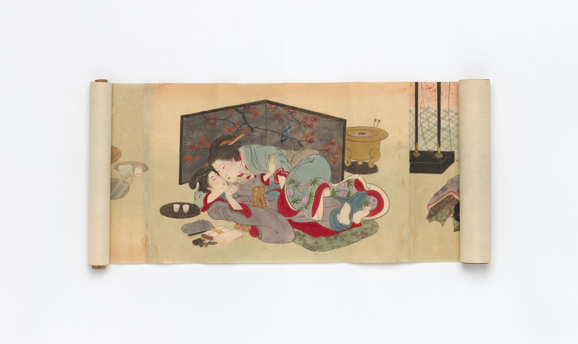 Neither the artist nor original owner of Shunga scroll, purchased by the NGV in 2020, had been identified at the time of this discussion. Dated to sometime between the 1840s and 1870s, the hand-painted scroll shows signs of wear and creasing consistent with age and repeated (perhaps hasty) opening and closing without careful tensioning of the paper. The work features six diverse erotic scenes involving individuals of various social rank and role. Among graphic tableaux of members of the noble class, townspeople and monks, two women appear to be engaged in a physical encounter concealed by their voluminous robes. The dynamic is ambiguous. One individual is larger than the other – a ukiyo-e convention often employed to symbolise comparatively greater age or status – and embraces her companion’s shoulders while tightly clasping their hand. Eye contact is direct, and rouged cheeks are a hair’s-breath apart. The smaller of the two figures holds the other’s elbow. It is unclear whether the larger figure’s concealed hand is being guided – or urged to stop. Socked feet, clenched, dangle mid-air. The burning brazier and pair of cups sitting forgotten beside the futon alongside an array of accoutrements indicate that the initial encounter was planned, though it seems impossible to know whether the interaction is one of consent, mutual desire, or the forceful coercion by one physically, or socially, dominant individual of another. Often shunga were accompanied by esoteric poems or humorous inscriptions to assist in the interpretation of scenes, yet this example is absent of any text. A close examination of the interior setting and material surrounding the two figures offers few clues. No images are discernible on the paper beside them. A furoshiki-wrapped package sits unopened, while an inro, a small portable case worn at the waist of kimono – often by men of status – may have held any manner of small objects, herbal medicines or aphrodisiacs. The blue bird on the maple-bough screen behind the two figures watches on with voyeuristic intrigue.