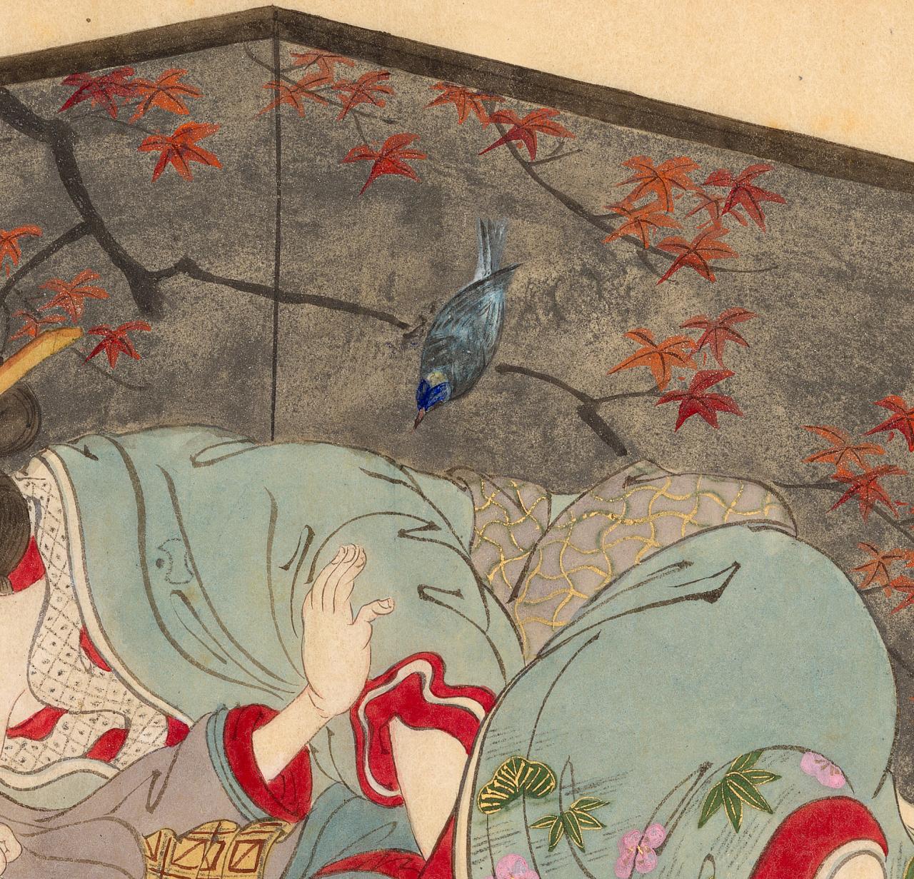 Though relevant within the broader context of audiences for female sex in shunga, these discussions offer little assistance in interpreting the Shunga scroll, which is unlike any other known example of sex between women. The work does not include any visible penetration, though it could be speculated that the furoshki-wrapped box next to the bed contains a harigata or related implement. Though there is no overt evidence of masculine presence, the protagonists are not alone. The blue bird peering forward from the screen behind them indicates an element of uninvited voyeurism, a frequently occurring theme in shunga (below).