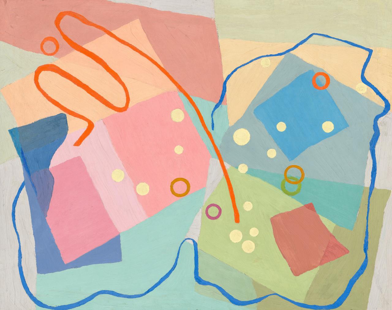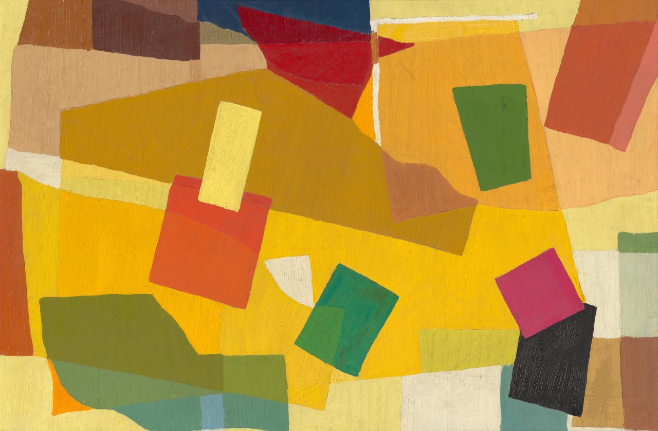 Crowley’s (Linear rhythm) and the purely geometric Untitled reflect the highly experimental approaches to composition that Crowley and Balson had begun to pursue in tandem, as observed by members of the Crowley-Fizelle circle. Mary Alice Evatt, a student at the Crowley-Fizelle school who went on to become a lifelong friend of Crowley, recalled: ‘For many years they planned their paintings helped by pieces of coloured paper and even slivers of string on paper’.25Mary Alice Evatt, ‘The Crowley Fizelle Art School’, in The Art Gallery of New South Wales Quarterly, vol 8, no. 1, Oct. 1966, pg. 314–16. Mary Alice and her husband, H. V. Evatt, were major supporters of Crowley’s work. With their indistinct, overlapping forms tilted at unpredictable angles, these three works by Crowley have a distinct collage-like quality consistent with their method of conception. Other constructive artists working in Europe and America used similar compositional techniques as a cornerstone of their practice. For instance, Piet Mondrian worked out his Neoplastic compositions by arranging strips of paper on top of stretched canvas.26 Pia Gottschaller, ‘From ruler to tape: stops and starts in the history of painted abstraction’, Getty Research Journal, no. 10, 2018, p. 6. Matisse developed the idea of moving around paper cutouts coloured with gouache to plan his large-scale mural The dance, 1932–33, for the Barnes Foundation, Philadelphia, and was pursuing collage as an autonomous art form by around 1946.27Gilles Neret, Matisse, Taschen, Cologne, 1996, p. 147.