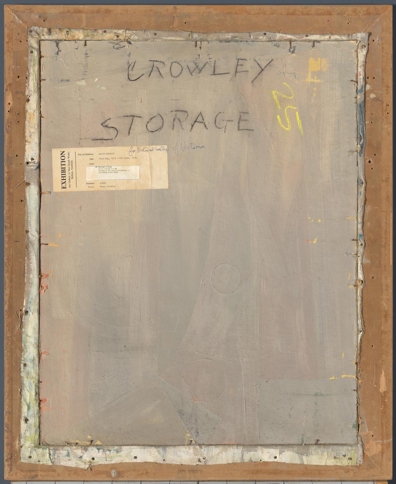 Among the works prepared for display was Crowley’s semi-abstract Portrait, 1939, which was acquired in 1981 as an bequest of the artist. Portrait still retained its original backing board, which had been painted grey and prominently inscribed with the words ‘Crowley’ and ‘storage’. Closer inspection revealed the word ‘Balson’ mysteriously inscribed in pencil on the back of the frame.