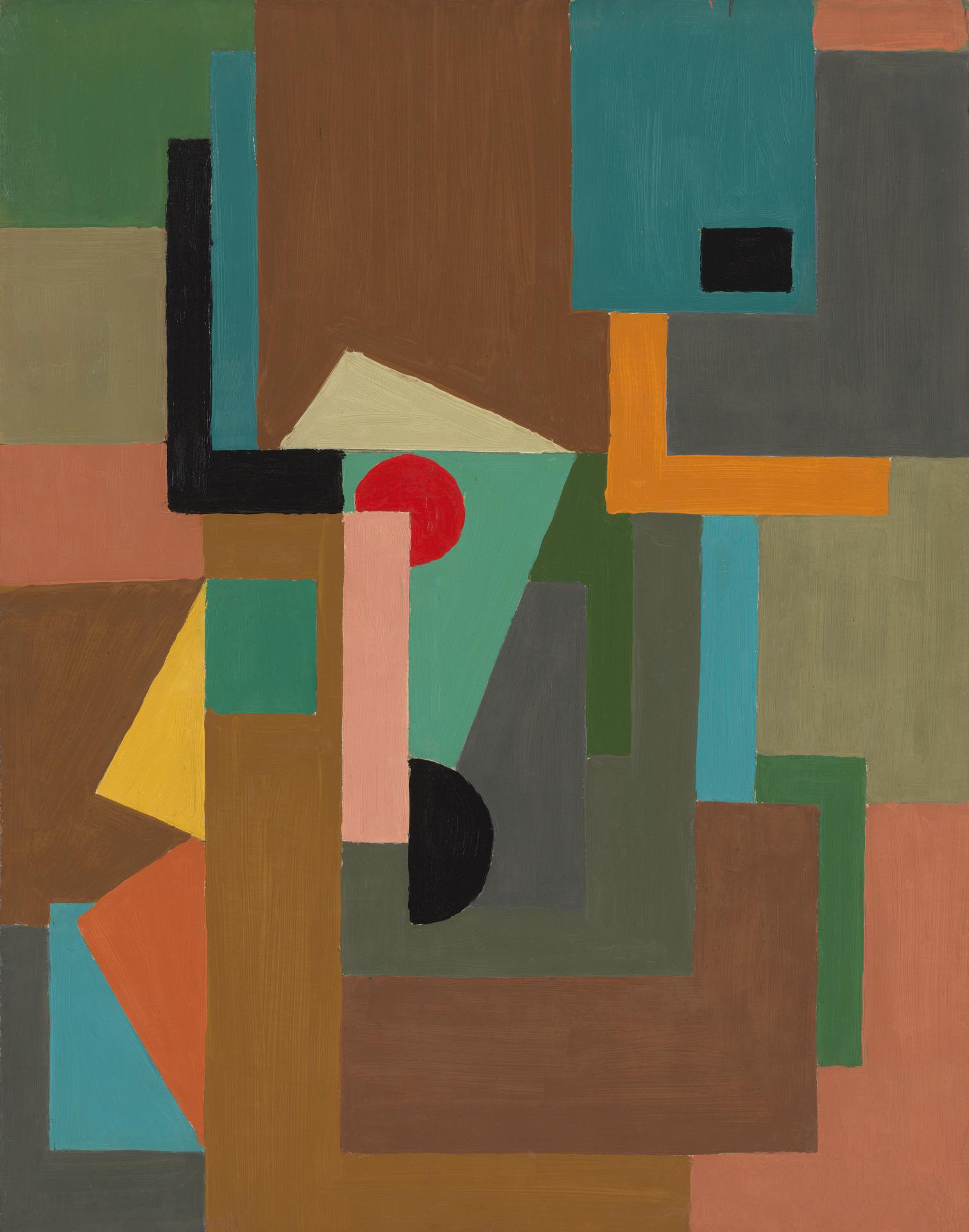 The works from Balson’s 1941 exhibition exemplify Lhote’s principles in their use of small areas of pure colour balanced with closely related tints applied to larger areas of the compositions. Balson often incorporated neutral hues such as grey and brown to surround or punctuate shapes rendered in vibrant colour, which act as a compositional anchor, creating a sense of poise and spaciousness in the composition. Although these paintings are based on simple solid shapes, there is a dynamic tension between the flat picture plane and implied space, as if the planes are advancing and receding, created through subtle variations in colour temperature and tone.