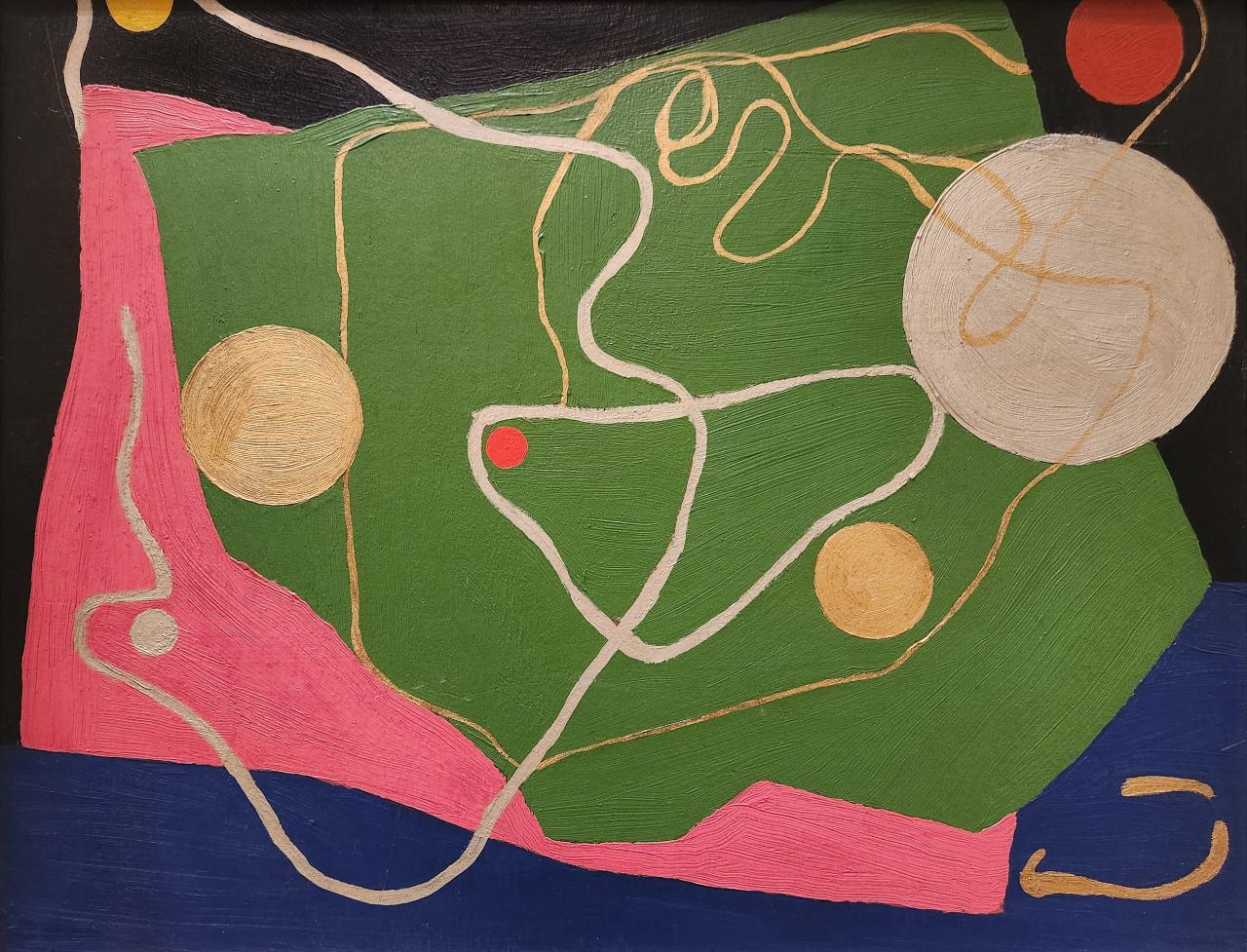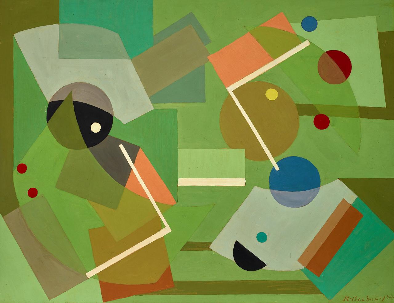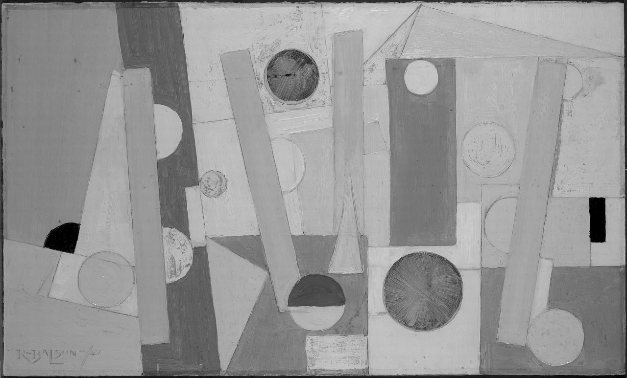 In July 1941, just shy of his fifty-first birthday, Balson mounted a solo show at Anthony Hordern’s Fine Art Gallery in Sydney, which was to be the first exhibition in Australia to exclusively comprise abstract paintings. The exhibition included a series of twenty-one sophisticated paintings featuring flattened geometric motifs, and nearly half of the works included the novel use of metallic paint alongside conventional oil paint. Referred to as his constructive paintings, these works emphasised dynamic compositional elements such as circles, diagonals and oblique shapes, and embodied a sense of exuberant modernity at odds with the prevailing mood of wartime uncertainty. Although Balson’s solo show was relatively overlooked at the time, it is now recognised as a watershed moment in Australian art history.