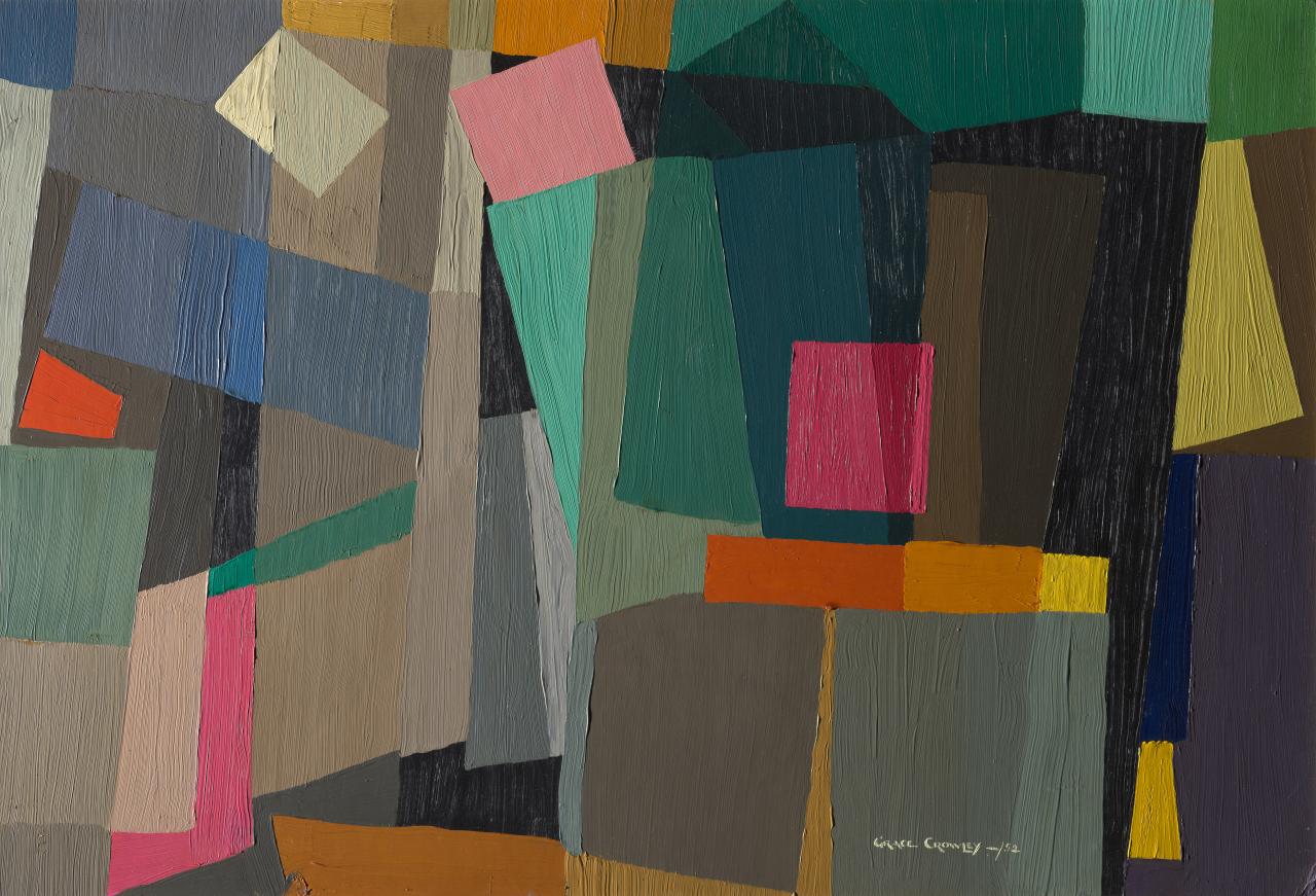 In 1944, Crowley and Balson participated in a group show at Macquarie Galleries in Sydney. Crowley exhibited six works titled Linear rhythm, with three priced at 12 guineas and three at 15 guineas, likely indicating that the works varied in scale. As with Crowley’s Construction, (1942), the location of the six Linear rhythm paintings remains unconfirmed. This notable absence of what was clearly a major and ambitious series for Crowley comprises part of a broader gap in signed and dated examples of her work between 1940 and 1946.
