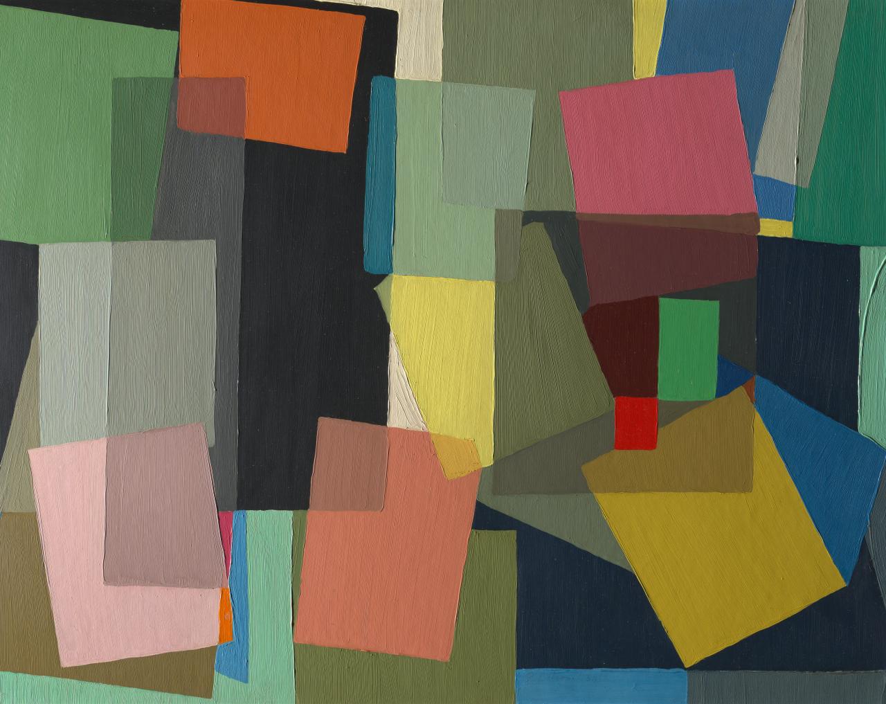 While Crowley did not exhibit alongside Balson at Anthony Hordern’s, in a retrospective note she recalled that they were both pursuing pure abstraction by 1940.16 Grace Crowley Papers, handwritten notes, c. 1975. In 1942, she exhibited Construction in the Society of Artists annual exhibition in Sydney, alongside Balson’s paintings Construction in green, 1942, and The construction – transparent planes, 1942. While the whereabouts of Crowley’s work are now unknown, Balson’s extant works indicate that the duo made a critical breakthrough at this time. Until this point, Balson’s geometric shapes were composed of solid colour; however, his 1942 works saw the introduction of the illusion of transparency, created through mixtures of opaque paint, giving the appearance that the shapes were translucent and light-filtering like panes of glass.