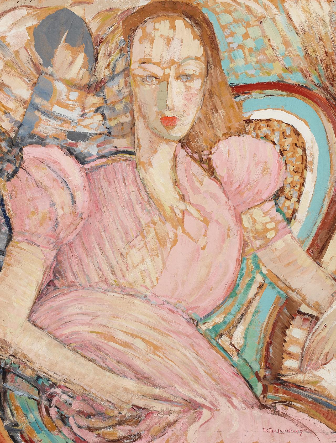 Crowley and Balson also began to take a more experimental approach to their painting supports, often forgoing a preparatory ground layer to explore the inherent textural qualities of their chosen substrates. For instance, Crowley’s Portrait was completed on the back of an abandoned painting on canvas, possibly started while she was in Europe. In this instance, Crowley flipped the canvas over and applied undiluted paint directly onto the unprimed canvas. The many areas of exposed canvas between the brushstrokes reinforces the materiality of the work and its emphatic flatness. Exhibition 1 also marking the beginning of Crowley and Balson’s interest in non–artist grade and industrial painting supports. Balson’s Girl in pink, 1937 (AGNSW), was painted sparsely onto unprimed cardboard, so that the support acts as a common compositional element, synthesising figure with background.