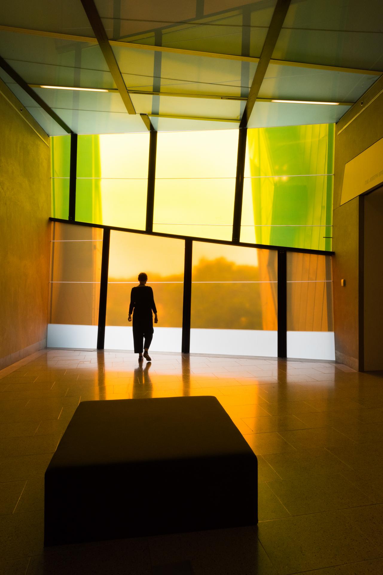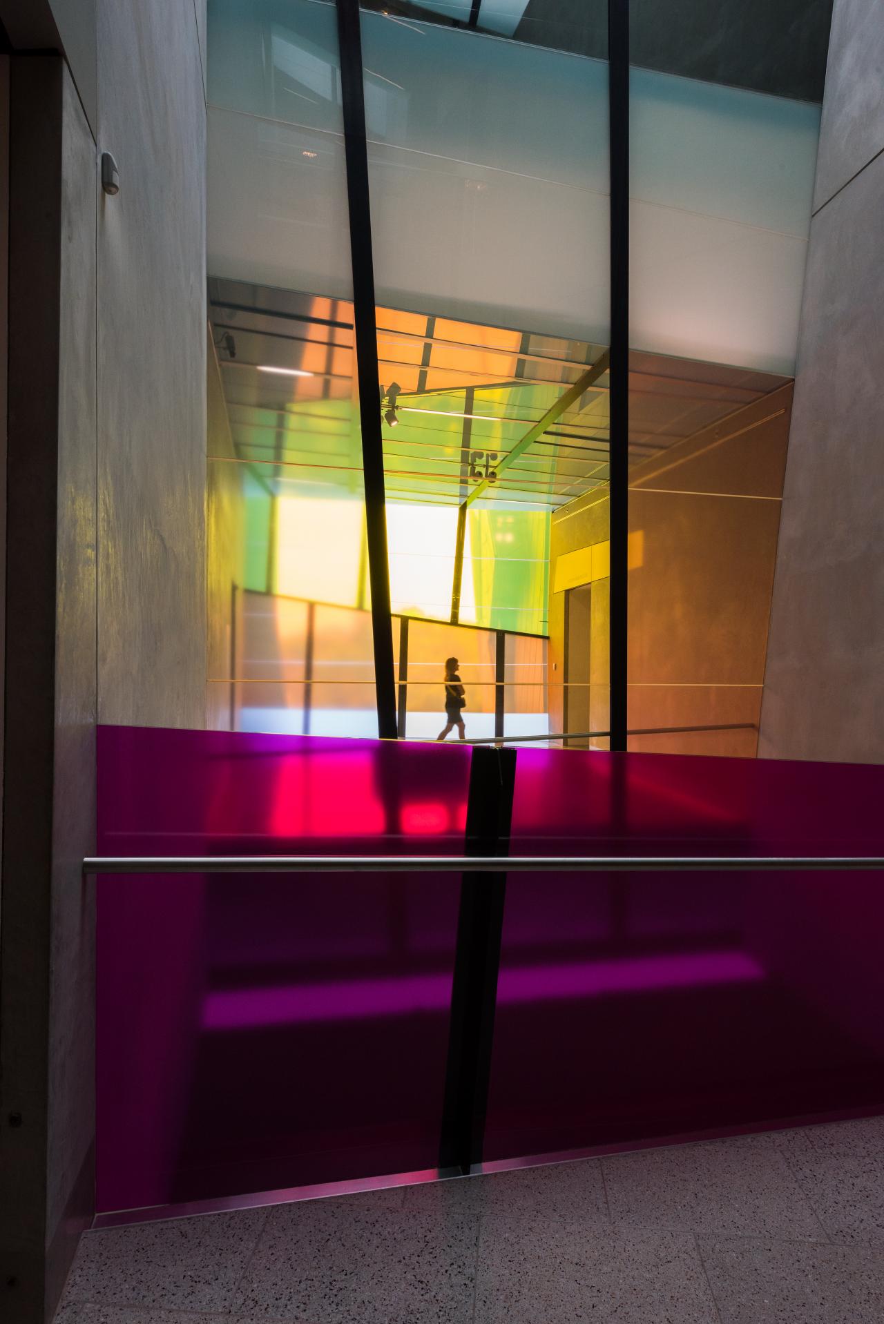 Rebecca Baumann: The work I created is called Window work (intersections and notations), 2018, which is an immaterial intervention with the architecture of the NGV. With this work I used coloured transparent vinyl on a series of parallel glass windows in the intrafilament spaces on level two of The Ian Potter Centre: NGV Australia. The panels of the windows and handrails will visually overlap and interact with each other, creating a choreography of colour which shifts as you change your viewing position and move throughout the different spaces. The work will have a temporal quality, affected by the changing atmospheric conditions of the outside world. Through the interrelationship of colour, light and time, I hope to generate shifts in the viewer’s perception and experience.