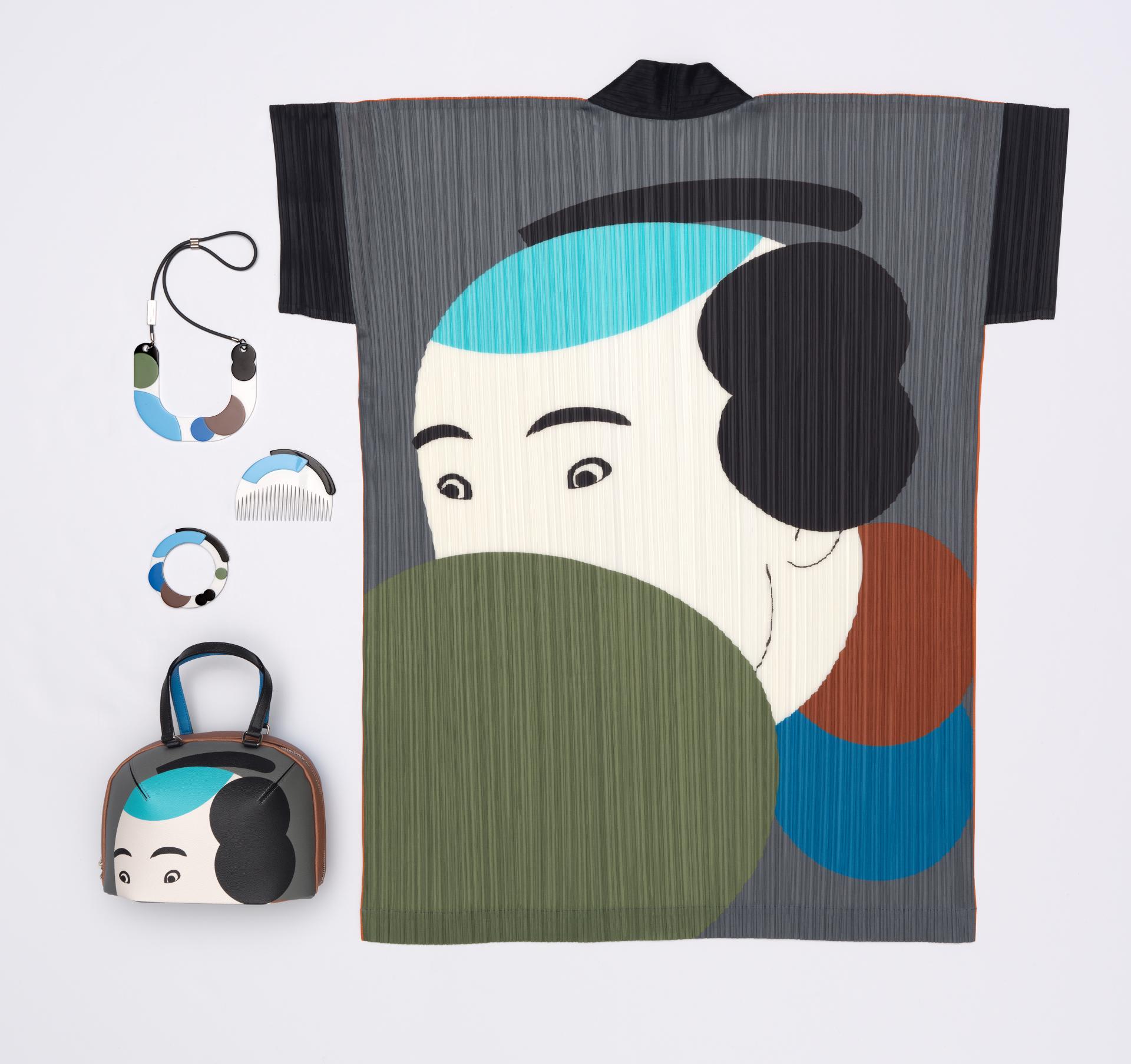 Both Sharaku and Maiko dancer (Nihon buyo) consist of an haori (thigh-length) kimono that incorporates Miyake’s trademark polyester pleated fabric, and are accompanied by a handbag, necklace, comb and bangle adorned with designs, shapes and colours appropriated from two of Tanaka’s most iconic posters.