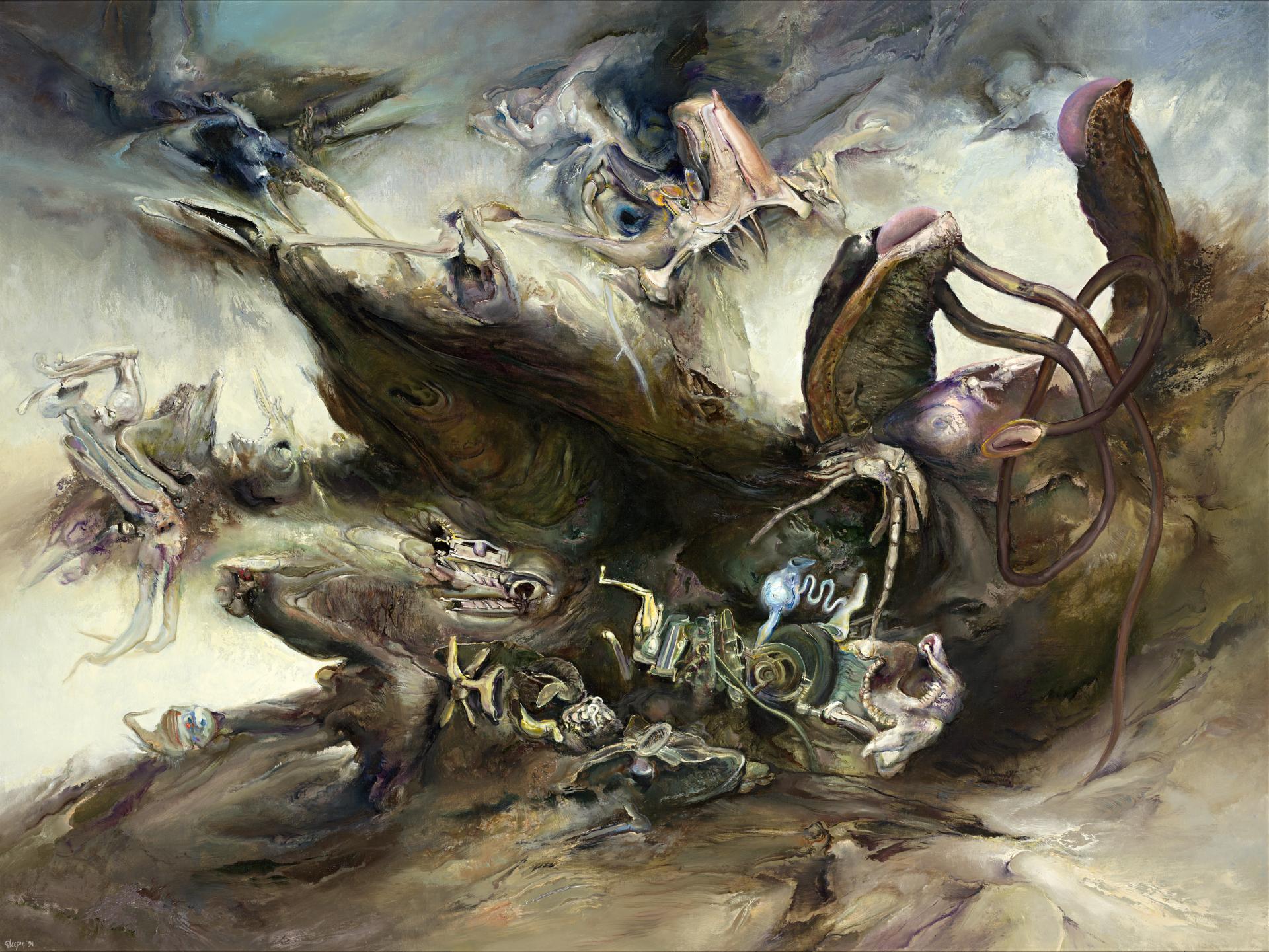 James Gleeson is Australia’s most significant surrealist artist. For over fifty years he has concerned himself with the art and literature of European artists associated with the Dada and Surrealist movements. The darkening stage is typical of Gleeson’s fascination with decay and growth and an evolving landscape of the imagination, while the dissolving organic forms in the painting conjure up the darkest nightmares. The darkening stage is an outstanding example of Gleeson’s recent work.