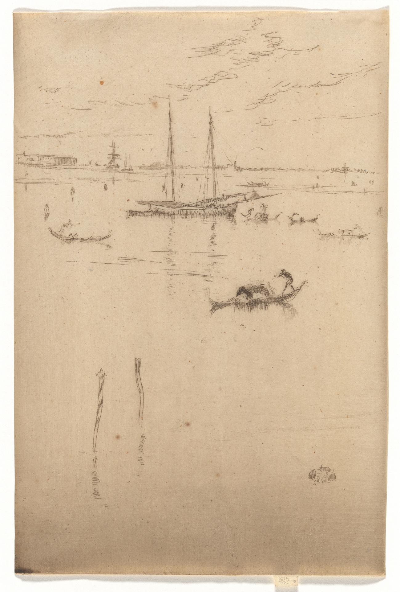 In September 1879 Whistler had been commissioned by the Fine Art Society to produce a set of prints in Venice, and was expected to return to London by the end of the year with twelve plates ready for publication. Instead, and much to the society’s frustration, he remained in Venice for fourteen months, during which time he produced numerous etchings and pastel drawings. He was captivated by the city and chose to depict its picturesque passages and alleyways, crumbling buildings and endless waterways rather than the more traditional, and touristic, grand palaces and churches. The little lagoon demonstrates Whistler’s fascination with the expanse of sky and sea, and the reflections thus created. The view was drawn directly onto the copper plate, possibly from Whistler’s pensione, which looked across the Venetian lagoon to the island of San Clemente. In this tranquil scene he evokes the atmospheric effects with a reduced number of etched and drypoint lines. These are enhanced by a layer of ink (known as plate-tone) that he carefully applied to the etched plate during the printing process, which smoothly progresses from dark to light, creating a sense of perspective and beautifully conveying the stillness of the water. In late 1880 the Fine Art Society exhibited Whistler’s twelve etchings, which became known as The first Venice set. The prints were received with mixed reviews, with one critic for The Daily News writing on 2 December 1880, ‘In the Little Venice and The Little Lagoon Mr Whistler has attempted to convey impressions by lines far too few for his purpose’. Few would now say that Whistler was unsuccessful with this exquisite etching.