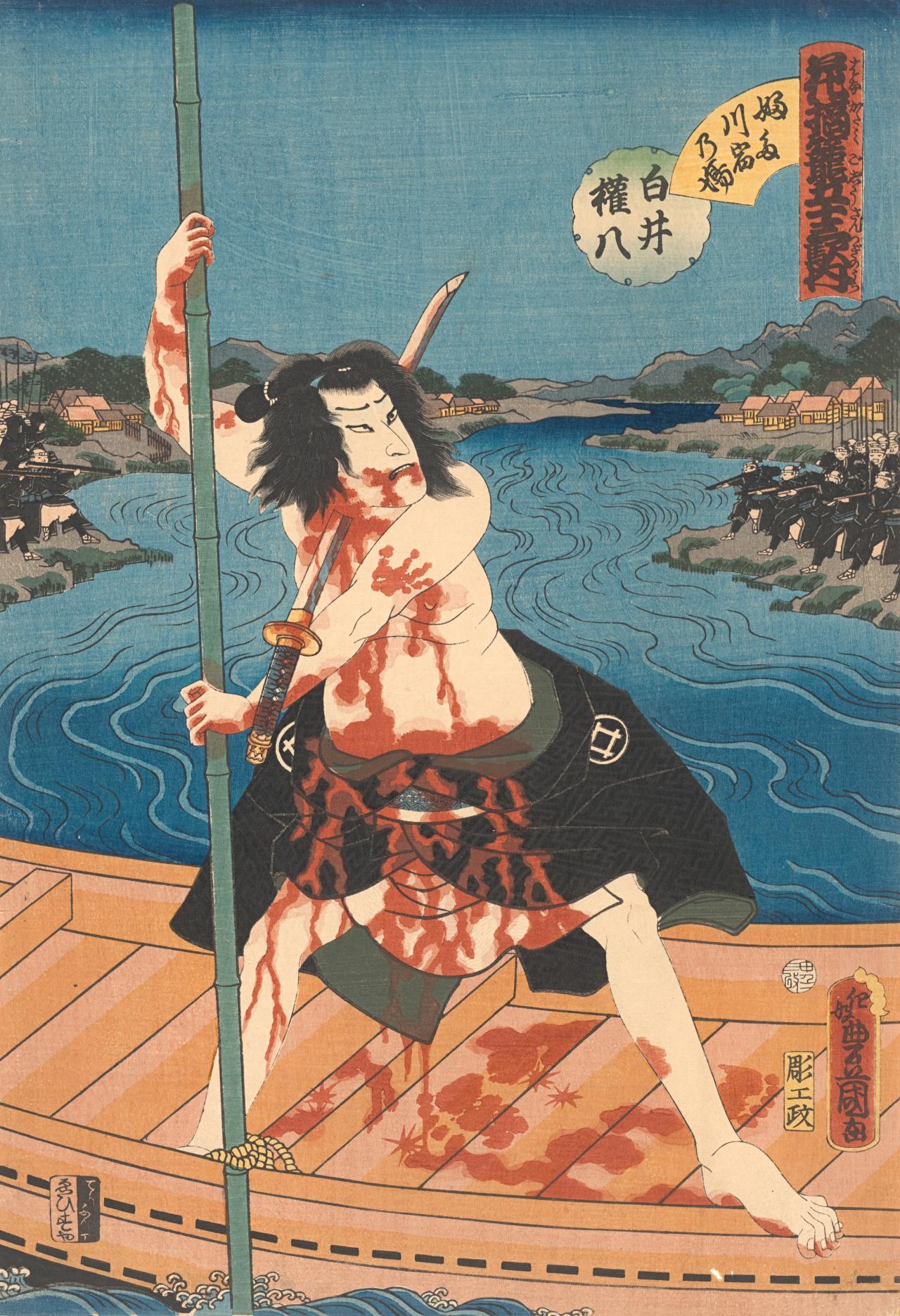‘Themes of blood’, such as suicides and murders, grew increasingly common on the kabuki stage in the period preceding the civil wars that led to the dissolution of the Tokugawa shogunate and the restoration of power to the Emperor in 1868. In Kunisada’s print, the gruesome beauty of blood is explored, its impact being heightened by the fine, hidden, black-on-black key-pattern printed on Gompachi’s garment.