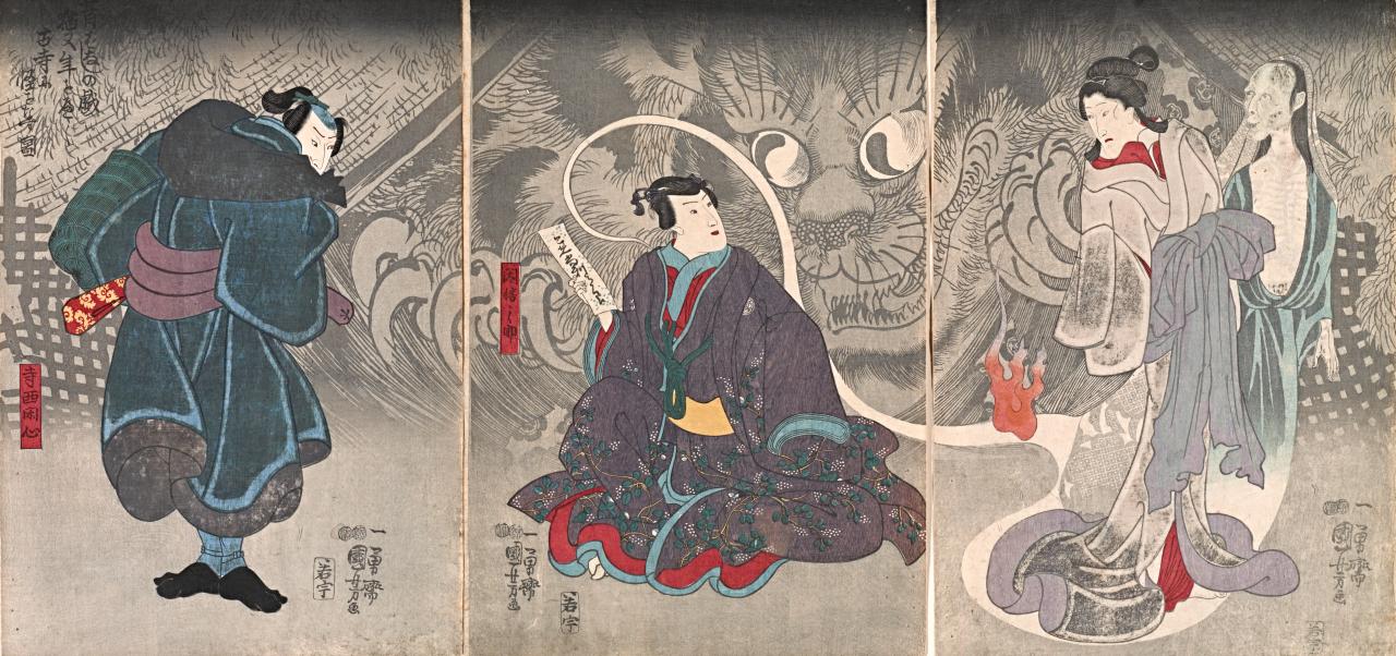 In the print Theatrical scene: the cat-spectre in the old temple, c.1847, by Utagawa Kuniyoshi, which shows a scene from the play The Last Story of the Actor Onoe Kikugoro (originally known as ‘Solitary Journey in the Fifty-Three Stations of the Tokaido’), the curtains are parted to reveal a gigantic cat-demon looming behind the main characters (fig. 7). Japan has many legends of cat sorcery in which the cat-demon is described as a huge creature possessing the supernatural power to assume human form and bewitch people. In Kuniyoshi’s print, the cat is linked by a curving spirit trail to the apparition, indicated by the spirit fire, in the right panel. Here, the cat-demon has manifested itself as an old woman, who is appearing with the ghost of the courtesan Usugumo. Seated in the centre panel is the samurai Inabanosuke. In the left panel is Teranishi Kanshi, a priest-turned-thief.